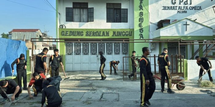 Detasemen Gegana Brimob Polda Sumut Kerja Bakti di Sekolah Minggu GPDI Alfa Omega Medan Berita, Medan, Sumut15/02/2026oleh Harian SumutSebarTweet