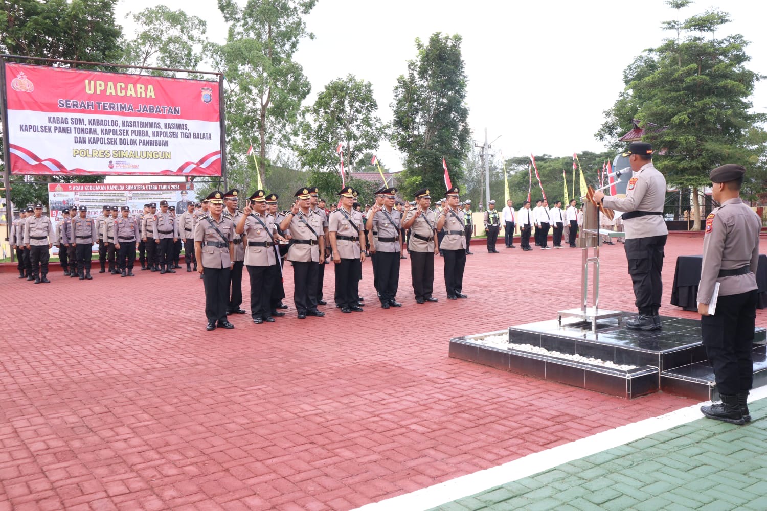 Kapolres Simalungun AKBP Marganda Aritonang, S.H., S.I.K., M.M., mendemonstrasikan kepemimpinan profesional dalam memimpin langsung upacara serah terima jabatan strategis yang melibatkan delapan posisi penting di lingkungan Polres Simalungun sebagai bagian dari upaya peningkatan kinerja pengamanan keamanan dan ketertiban masyarakat (kamtibmas).
