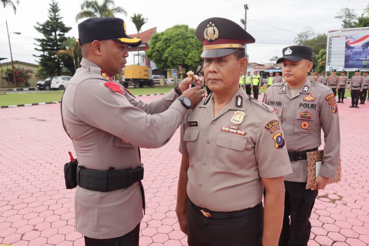Kompol Bungaran Samosir resmi naik pangkat satu tingkat lebih tinggi pada Senin (8/12/2025) di Lapangan Apel Mapolres Toba.