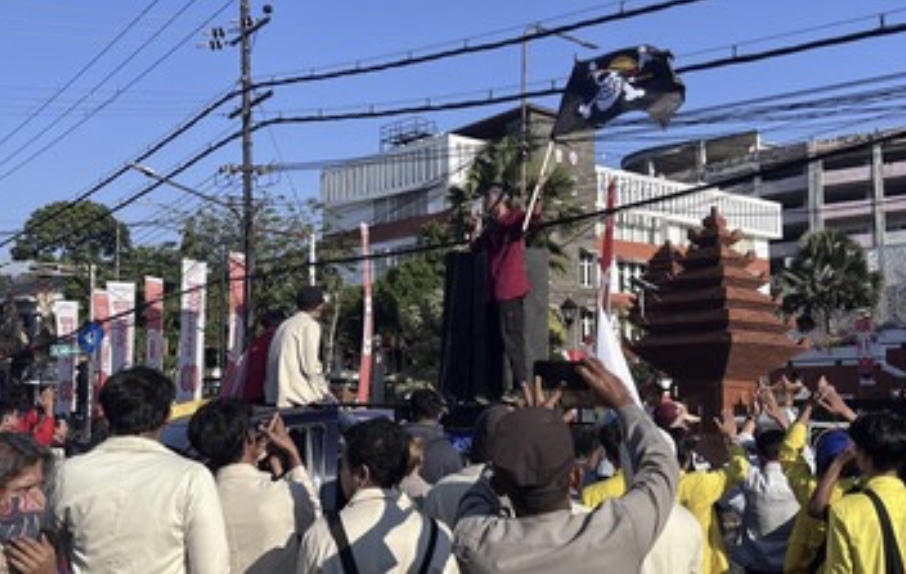 Ratusan Mahasiswa Surabaya dari Aliansi BEM Surabaya melakukan aksi demonstrasi di Gedung DPRD Jawa Timur (Jatim) dengan mengibarkan bendera Jolly Roger dari anime One Piece pada Jumat (15/8).