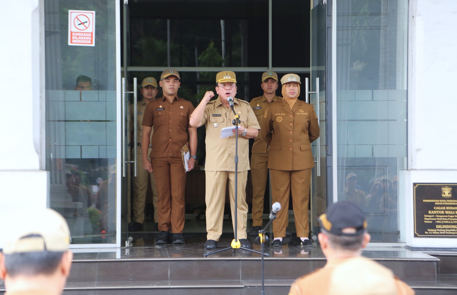 Wali Kota Pematangsiantar Wesly Silalahi SH MKn menjadi Pembina Apel Gabungan Aparatur Sipil Negara (ASN) Pemerintah Kota (Pemko) Pematangsiantar. Sedangkan bertindak sebagai Komandan Apel, Kepala Bagian Kesejahteraan Rakyat (Kabag Kesra) Setdako Irwansyah Saragih SSos MSi.