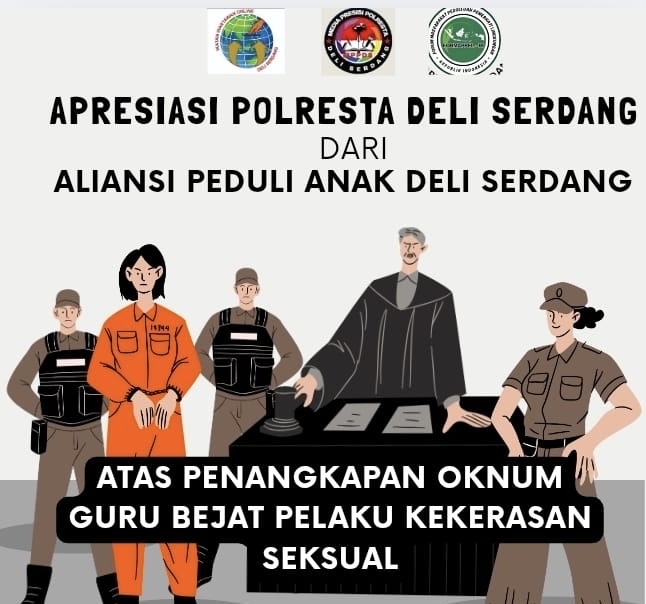 Aliansi Peduli Anak Deli Serdang yang terdiri dari IW0 Deli Serdang, Media Presisi Polresta Deli Serdang (MPPDS), dan Forum Masyarakat Peduli dan Pemerhati Lingkungan Republik Indonesia (FORMAPPEL RI), menyampaikan apresiasi setinggi-tingginya kepada pihak Kepolisian Resor Deli Serdang atas langkah cepat dan tegas dalam menangkap oknum guru berinisial MK, yang diduga melakukan pelecehan seksual terhadap salah satu siswi SMP Negeri 1 Beringin. 18/7/2025.