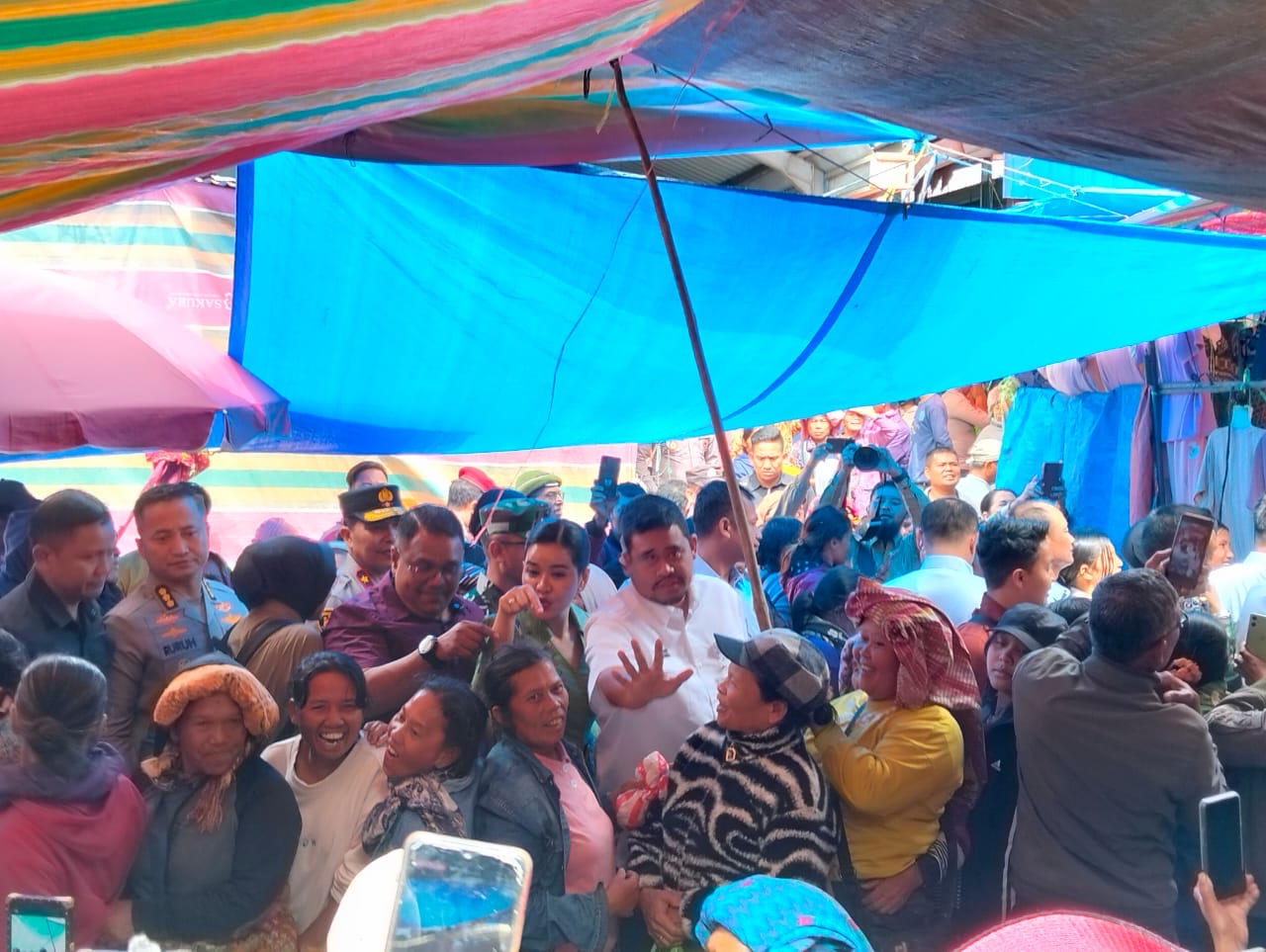 Usai dari puskesmas, rombongan melanjutkan kunjungan ke Pasar Tradisional Humbang Hasundutan. Di sini, Bobby Nasution turut membagikan susu kepada warga dan berdialog dengan pedagang.