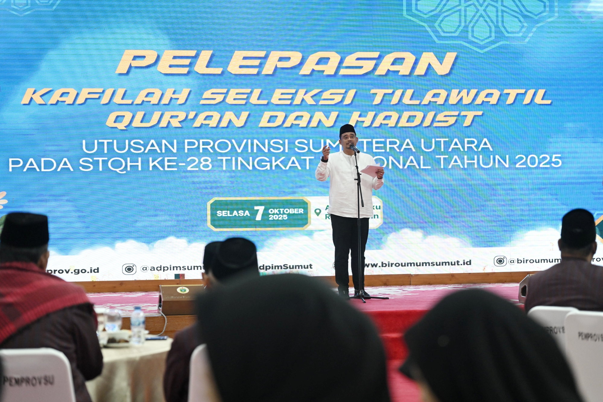 Gubernur Sumatera Utara (Sumut) Bobby Nasution secara resmi melepas keberangkatan Kafilah Sumut, yang akan bertanding di Seleksi Tilawatil Qur’an dan Hadits (STQH) ke-28 tingkat nasional di Kendari, Sulawesi Tenggara. Acara pelepasan berlangsung di Aula Tengku Rizal Nurdin, Jalan Sudirman No. 41 Medan, Selasa (7/10/2025) malam.