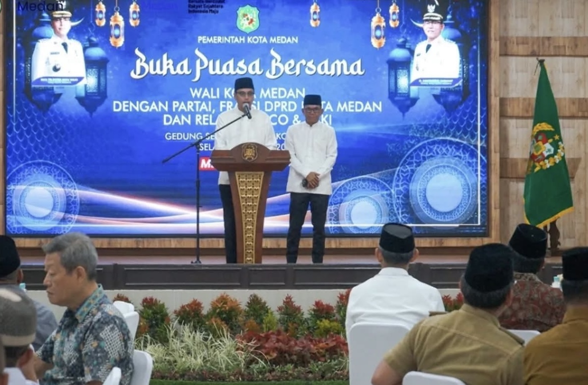 Suasana hangat menyelimuti acara buka puasa bersama Wali Kota Medan, Rico Tri Putra Bayu Waas dengan relawan Rico & Zaki, Partai dan Fraksi DPRD kota Medan di Gedung PKK Kota Medan, Selasa (10/3/2026).
