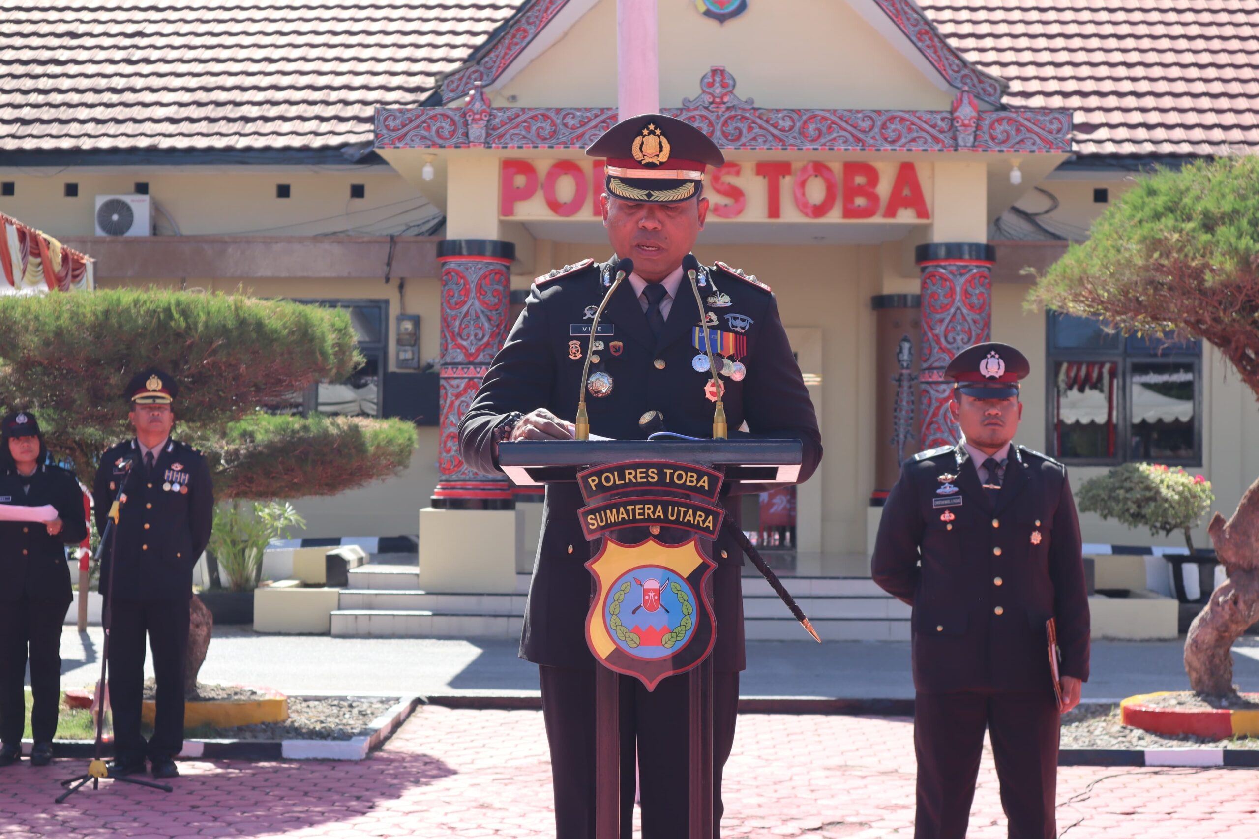 Dalam pelaksanaan upacara ini Kapolres Toba membacakan amanat dari Kapolda Sumut, Irjen Pol Whisnu Hermawan Februanto, mengucapkan syukur karena bisa melaksanakan Upacara Hari Bhayangkara ke-79 tahun 2025 dalam suasana penuh semangat pengabdian.