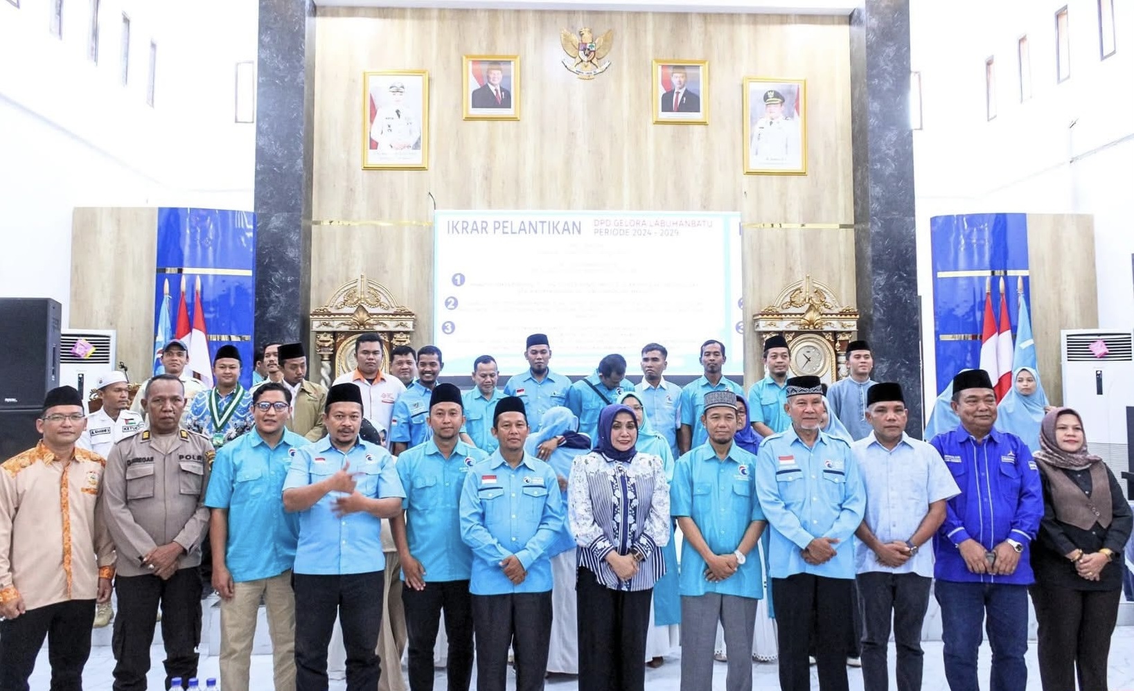 Bupati Labuhanbatu dr. Hj. Maya Hasmita Sp.OG. M.KM melalui Kadis Capil Maznil Khairi SE, menghadiri pelantikan pengurus DPD Partai Gelora Kabupaten Labuhanbatu, di Aula Pendopo Rumah Dinas Bupati, Jalan W.R Supratman, Kecamatan Rantau Utara, Minggu (28/9/2025).