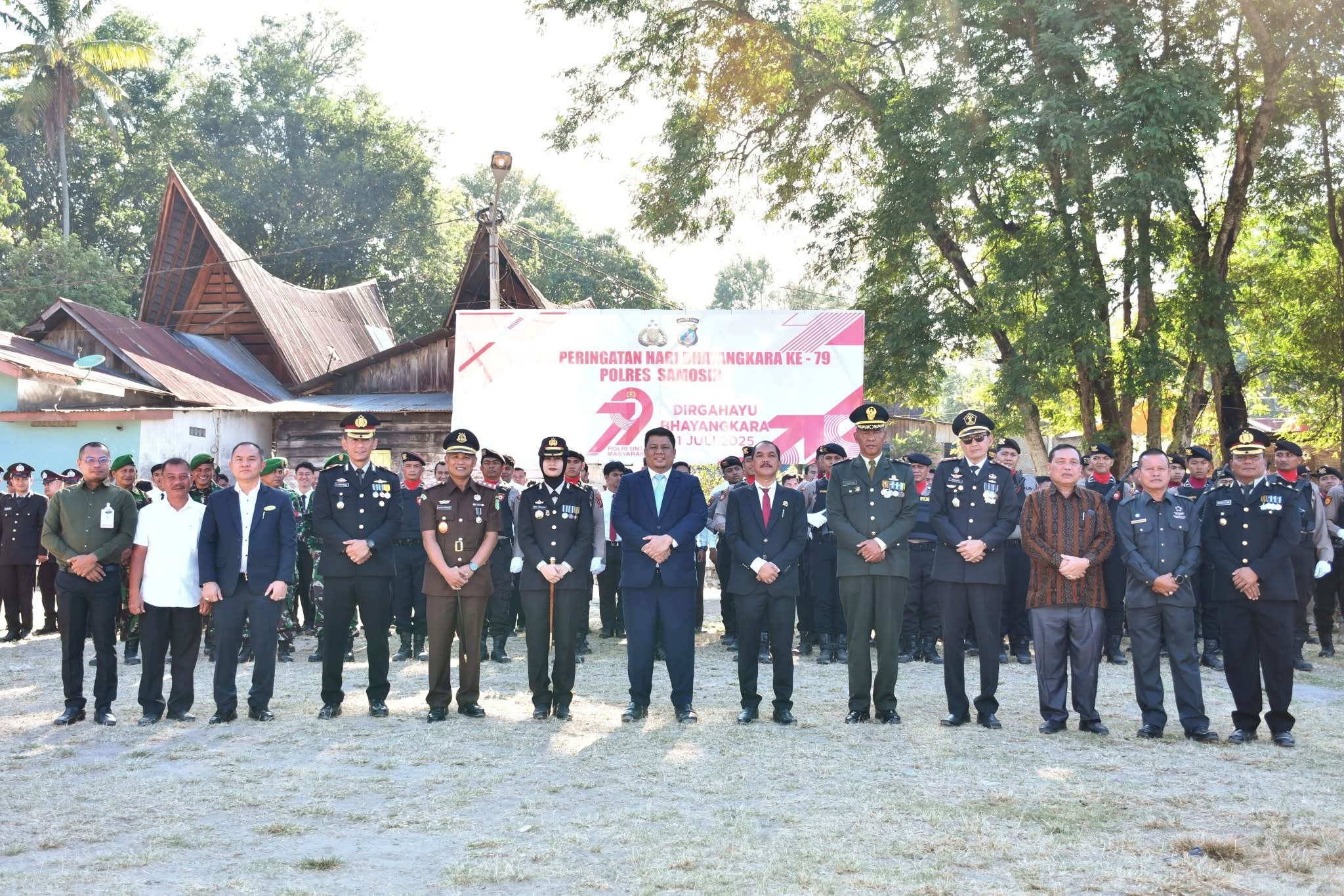 Bupati Samosir Vandiko Timotius Gultom, ST bersama unsur Forkopimda Ketua DPRD Samosir Nasip Simbolon, Kajari Samosir Karya Graham Hutagaol, SH, M.Hum, Pabung Kodim 0210/TU Mayor G. Sebayang mengikuti Upacara HUT Bhayangkara ke-79 yang digelar di Tanah Lapang Pangururan, Selasa (1/72025). Bertindak sebagai Inspektur Upacara Kapolres Samosir AKBP Rina Frillya, S.I.K.