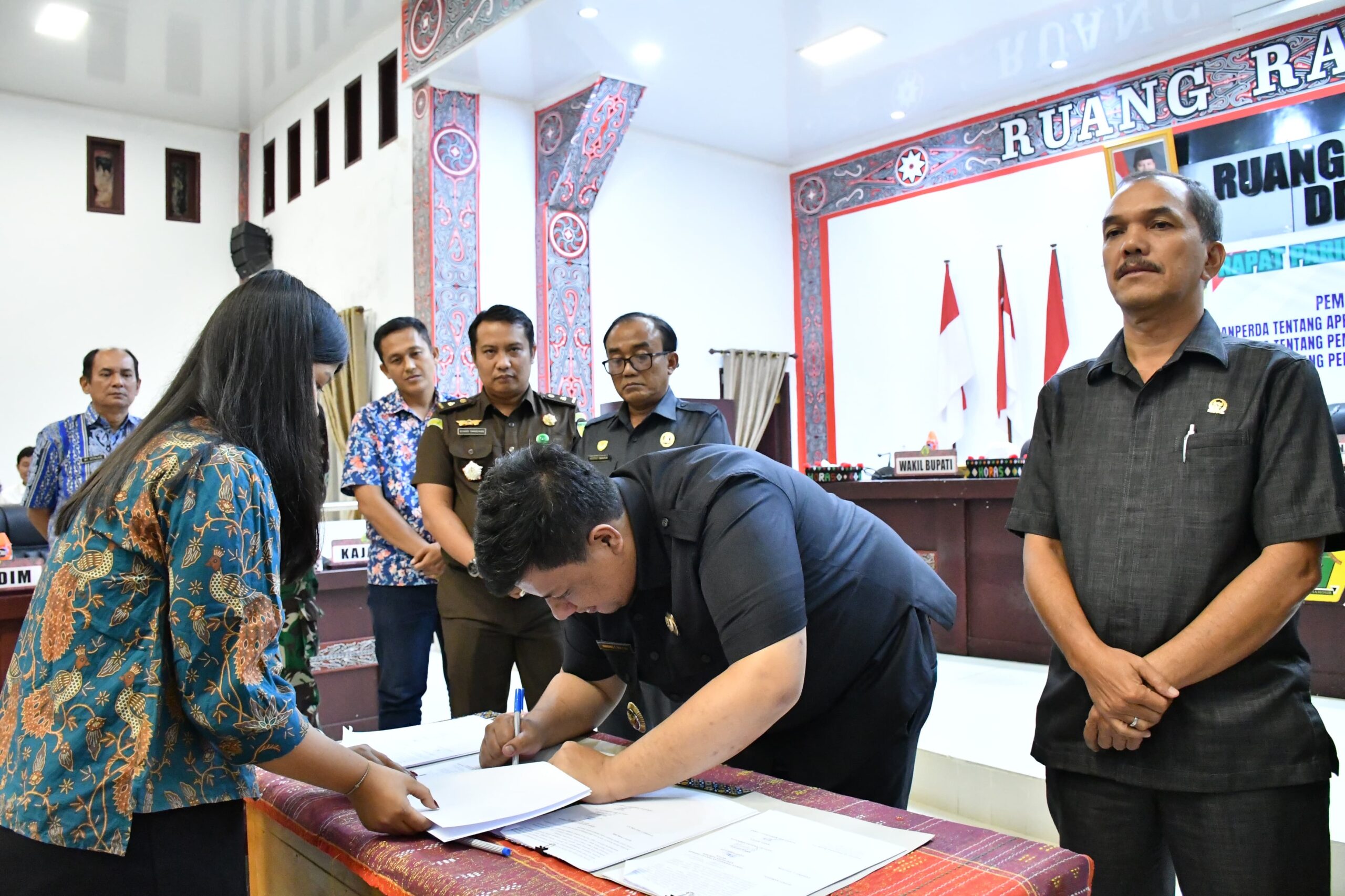 Ranperda APBD Kabupaten Samosir tahun anggaran 2026 resmi ditetapkan menjadi Perda. Persetujuan tersebut dituangkan dalam nota kesepakatan bersama yang diteken Bupati Samosir Vandiko T. Gultom bersama Ketua DPRD Nasip Simbolon, Wakil Ketua DPRD Osvaldo Ardiles Simbolon, Sarhochel Martopolo Tamba dalam rapat paripurna yang digelar di Ruang Rapat DPRD Samosir, 28/11.