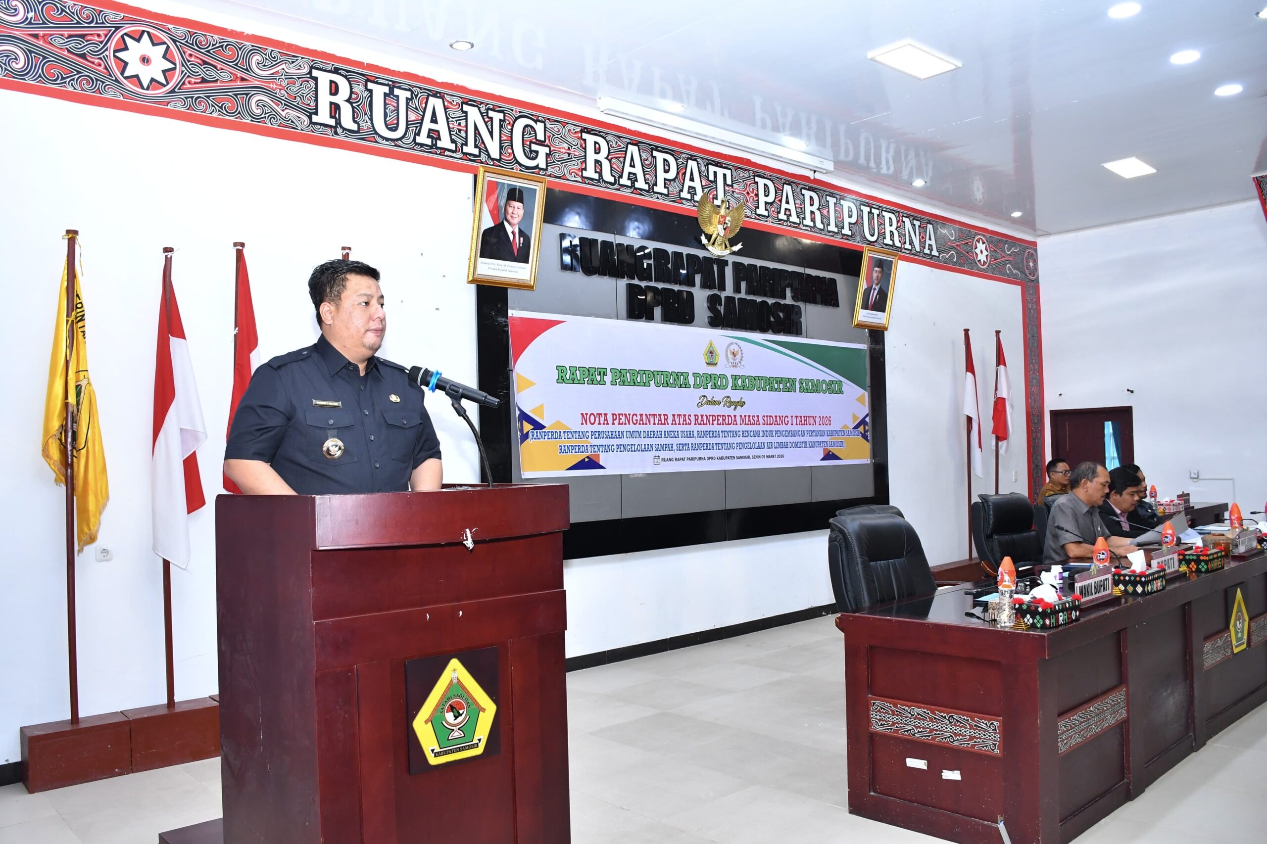 Dalam nota pengantarnya, Bupati Samosir Vandiko T. Gultom menyampaikan apresiasi kepada pimpinan dan anggota Dewan Perwakilan Rakyat Daerah Kabupaten Samosir yang selama ini terus mendukung penyusunan berbagai produk hukum daerah sebagai pedoman penyelenggaraan pemerintahan dan pembangunan di Kabupaten Samosir.