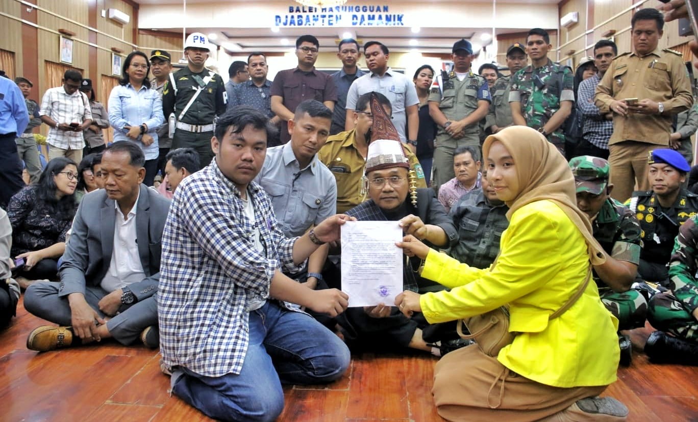 Bupati juga menandatangani fakta integritas sebagai bentuk komitmen nya untuk memenuhi semua tuntutan. Pertemuan antara Bupati dengan aksi unjuk rasa diakhiri dengan bersalaman.