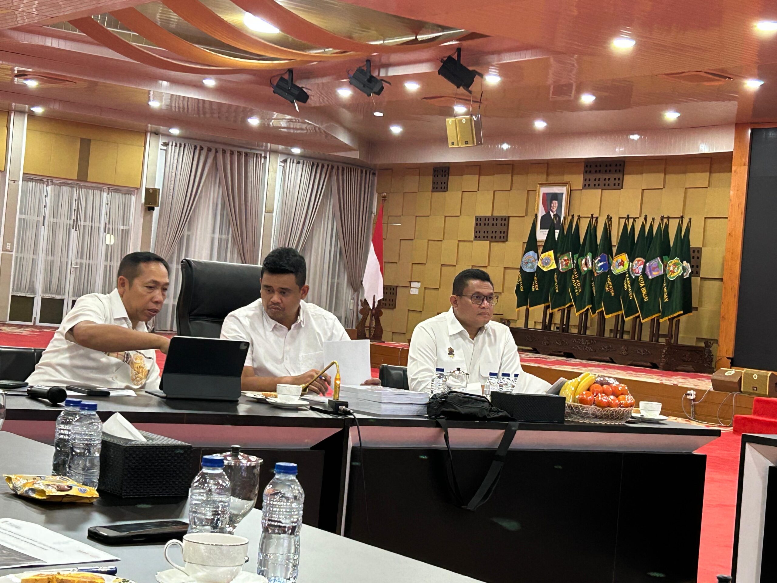 Bupati Tapanuli Utara Dr. Jonius Taripar Parsaoran Hutabarat, S. Si, M. Si bersama Gubernur Sumatera Utara (Gubsu) Moh. Bobbi Afif Nasution menghadiri Rapat Koordinasi Lanjutan Pembahasan Pembangunan Hunian Tetap (Huntap) pasca bencana di wilayah Sumatera secara hybrid bertempat Aula Tengku Rizal Nurdin Rumah Dinas Gubsu, Medan, Minggu (28/12/2025).