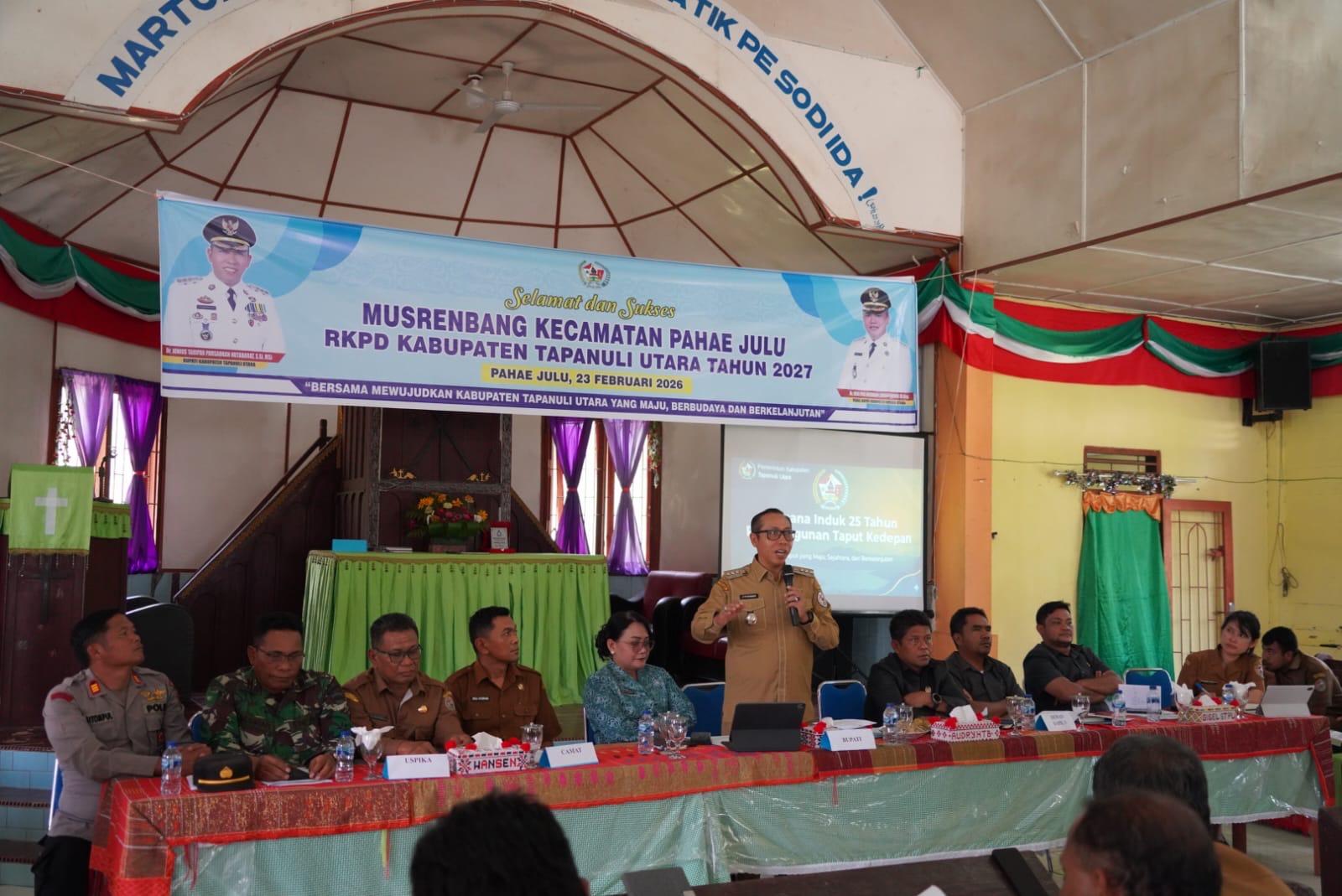 Bupati Tapanuli Utara Dr. Jonius Taripar Parsaoran Hutabarat, S. Si., M. Si didampingi Ketua TP PKK Ny. Neny Angelina JTP Hutabarat secara resmi membuka Musyawarah Perencanaan Pembangunan (Musrenbang) Kecamatan Pahae Julu yang dilaksanakan di Gereja HKBP Lumban Garaga, Pahae Julu, Senin (23/2/2026).