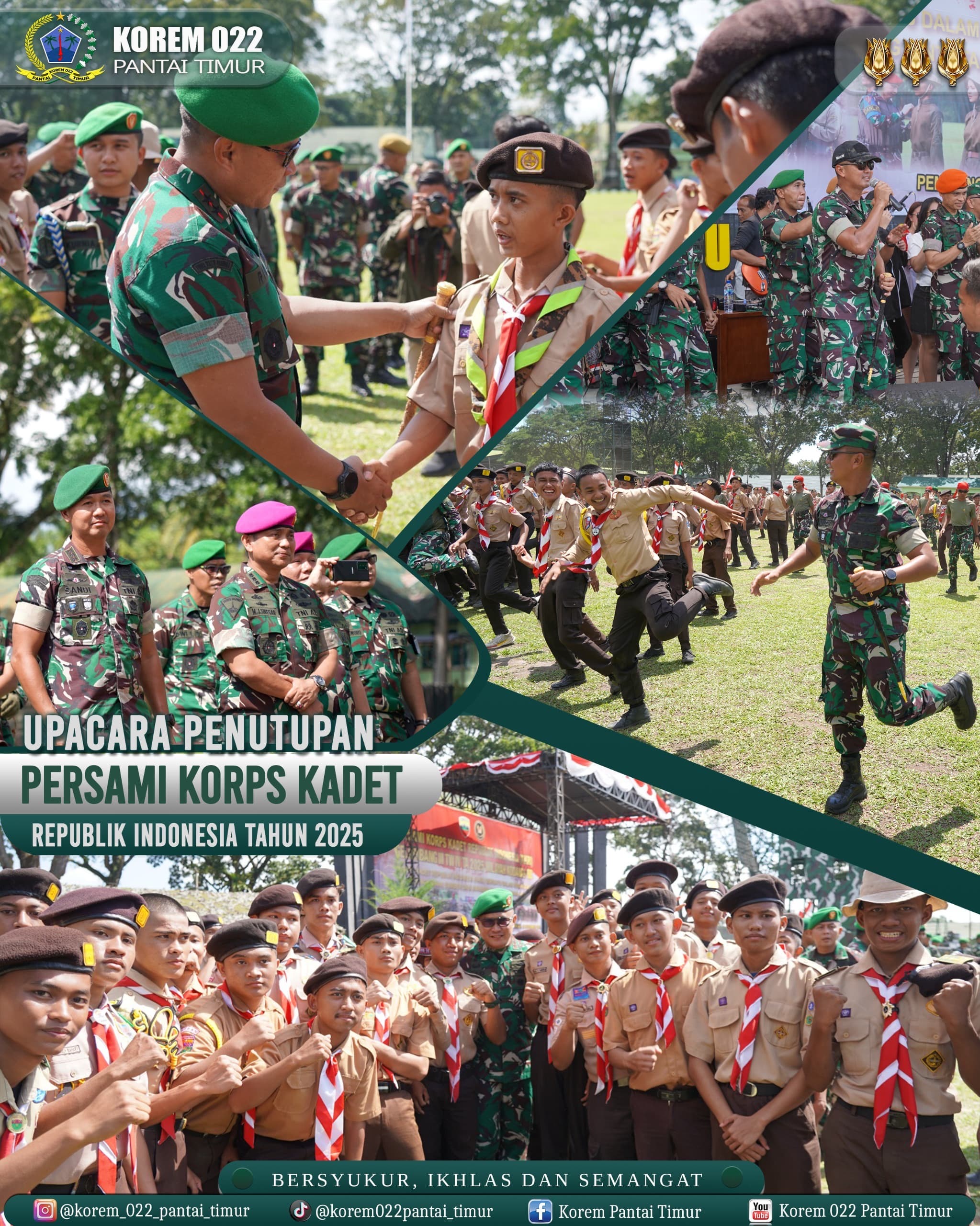Komandan Korem 022/Pantai Timur Kolonel Inf Sandi Kamidianto, S.I.P., M.I.P., menghadiri penutupan Kegiatan Kaderisasi Komponen Cadangan Korps Kadet Republik Indonesia (KKRI) Gelombang III Tahun 2025 yang diselenggarakan oleh Kodam I/Bukit Barisan di Rindam I/BB. Kegiatan tersebut diikuti oleh peserta dari berbagai Sekolah, termasuk para siswa SMA dan SMK binaan Korem 022/PT yang berhasil menorehkan prestasi membanggakan, Minggu (2/11/2025).