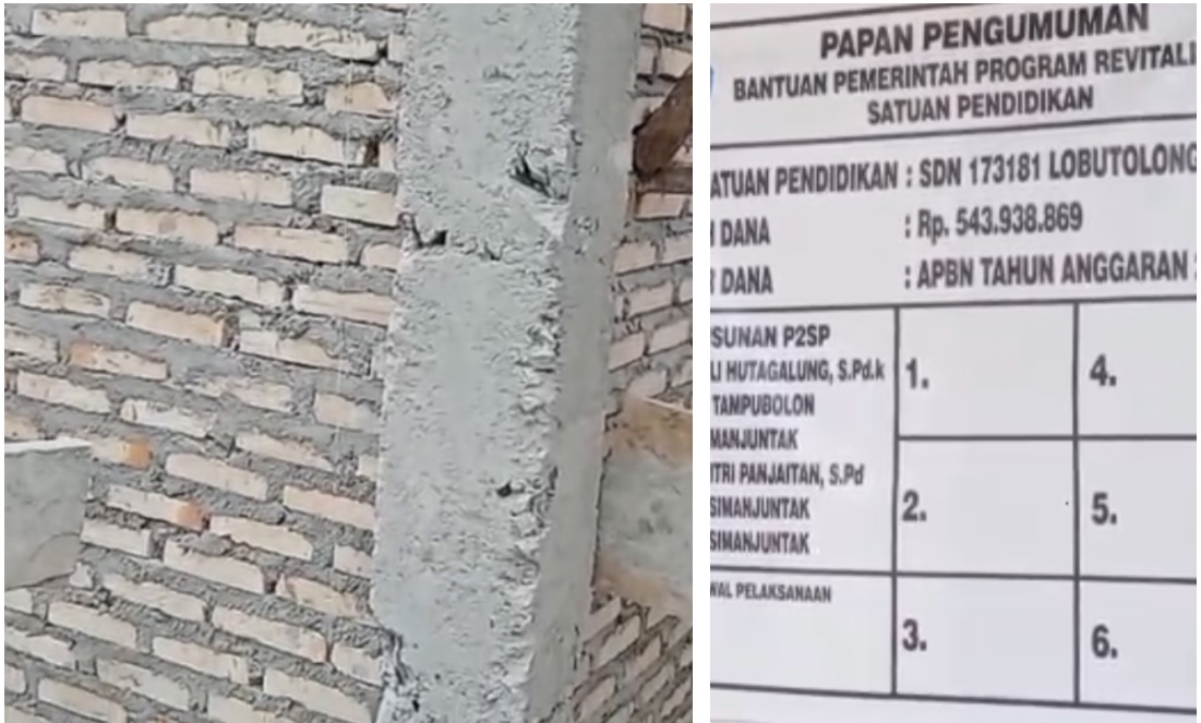 Sementara itu, hasil pantauan di salah satu sekolah, Rabu (25/2/2026) yakni SD Negeri 173181 Lobu Tolong, menunjukkan kualitas campuran material yang dipertanyakan. Campuran semen pada bangunan dinilai tidak sesuai standar karena disebut dapat terkelupas dengan tangan.