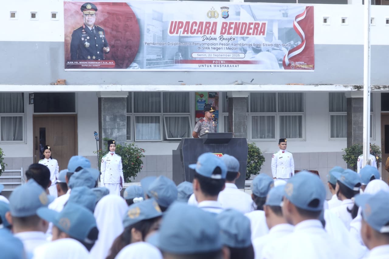 Kapolda Sumatera Utara jadi Inspektur upacara bendera di SMA Negeri 1 Medan pada Senin (22/9/2025) dan menyampaikan amanat penuh makna bagi para siswa-siswi. Kehadirannya disambut antusias oleh guru, staf, dan seluruh pelajar yang mengikuti jalannya upacara dengan khidmat.