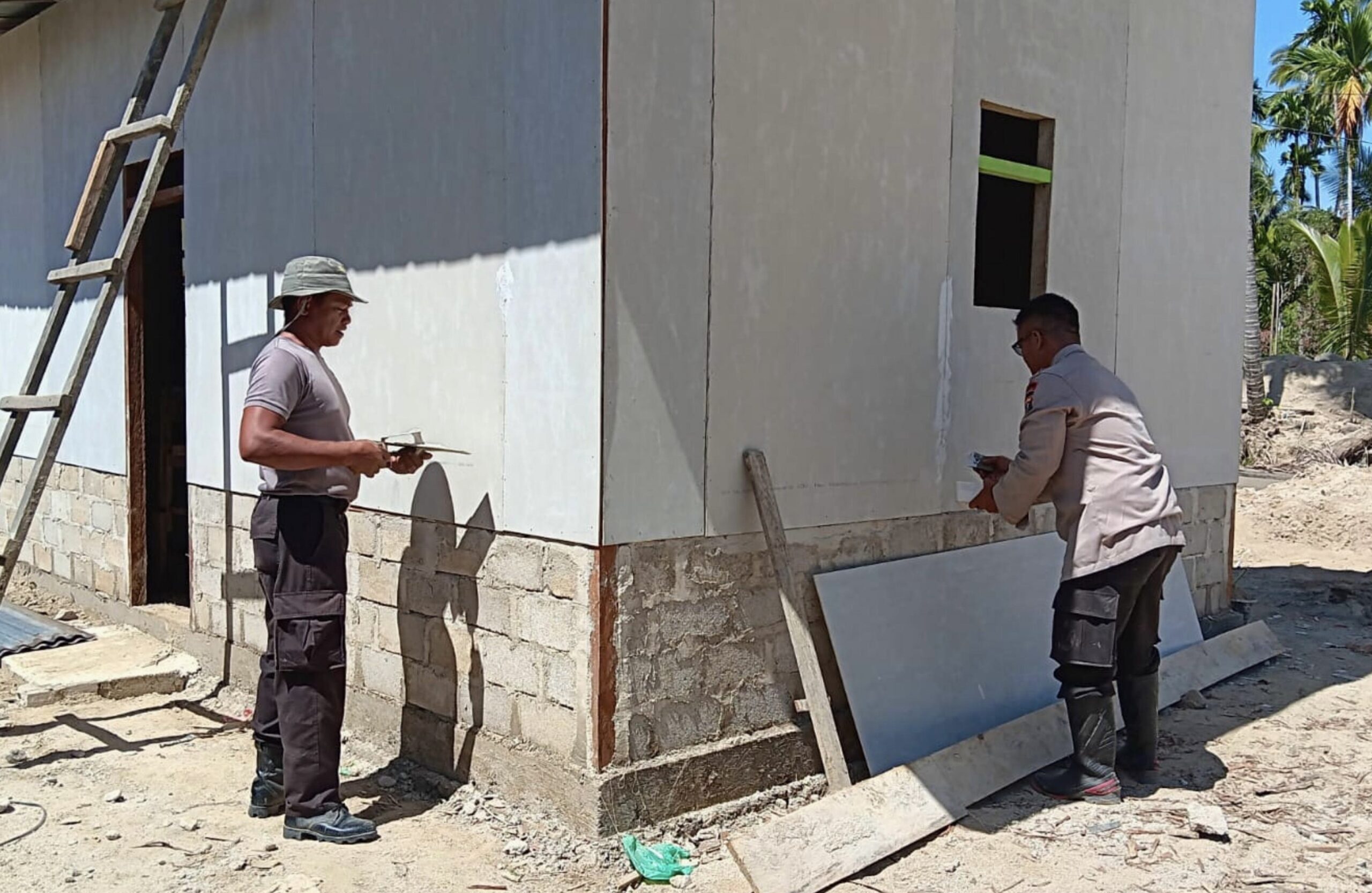 Personel Brimob bersama warga bergotong royong melakukan berbagai tahapan pekerjaan, mulai dari pembersihan area rumah swadaya, pendempulan dinding rumah hunian sementara berbahan IRC, hingga perataan tanah di sekitar lokasi pembangunan. Hingga saat ini, pembangunan hunian sementara telah mencapai unit ke-11 yang dikerjakan secara bertahap.