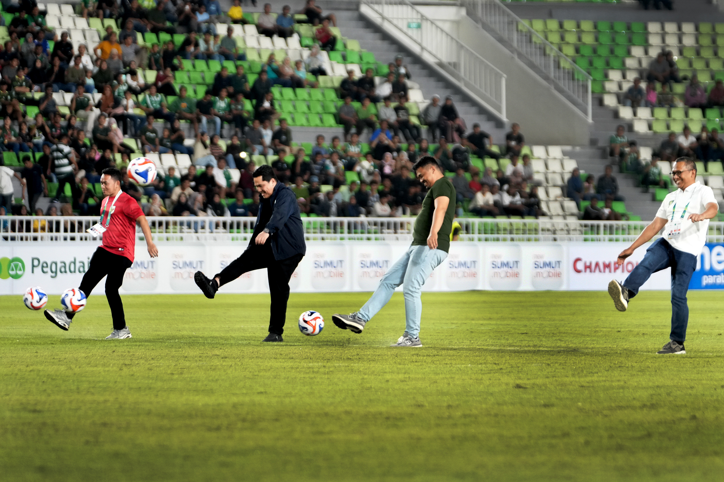 Gubernur Sumatera Utara (Sumut) Bobby Nasution bersama Ketua Persatuan Sepakbola Seluruh Indonesia (PSSI) Erick Thohir membuka secara resmi Pegadaian Championship 2025/2026 di Stadion Utama Sumut, Deliserdang, Jumat (12/9/2025). Pembukaan ditandai oleh sepakan bola oleh keduanya.