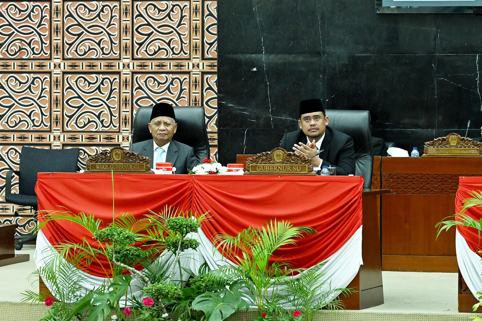 Gubernur Sumatera Utara (Sumut) Bobby Nasution bersama Wakil Gubernur (Wagub) Surya, menghadiri Rapat Paripurna DPRD Sumut dengan agenda mendengarkan Pidato Kenegaraan Presiden RI dalam rangka Penyampaian Pengantar/Keterangan Atas RUU tentang APBN Tahun Anggaran 2026. Acara yang berlangsung secara virtual itu dilaksanakan di Gedung Paripurna DPRD Sumut, Jalan Imam Bonjol Medan, Jumat (15/8/2025).