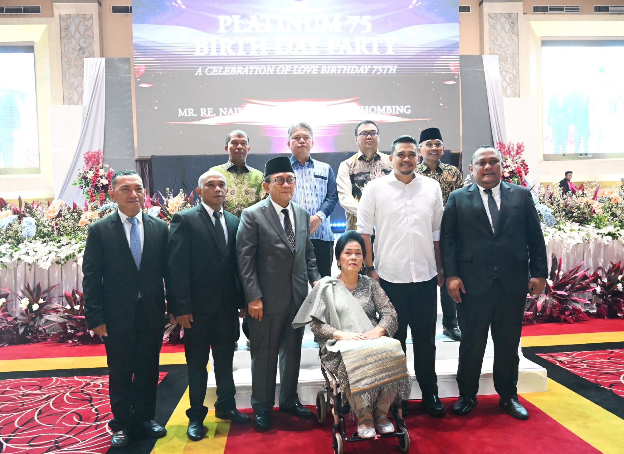 Gubernur Sumatera Utara (Sumut) Muhammad Bobby Afif Nasution menghadiri perayaan hari ulang tahun ke-75 tokoh masyarakat Rustam Efendi (RE) Nainggolan di REGALE International Convention Centre, Jalan Adam Malik Medan, Jumat (21/11/2025) malam.