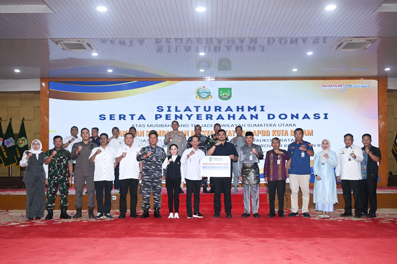 Bantuan tersebut diserahkan langsung oleh Walikota Batam Amsakar Achmad bersama Wakil Walikota Batam Li Claudia Chandra kepada Gubernur Sumut Bobby Nasution di Aula Tengku Rizal Nurdin, Jalan Sudirman Nomor 41 Medan, Kamis (8/1/2026). Total bantuan yang diserahkan sebesar Rp4.700.000.000, terdiri dari bantuan APBD Kota Batam sebesar Rp2.500.000.000 dan donasi masyarakat Kota Batam sebesar Rp2.200.000.000.