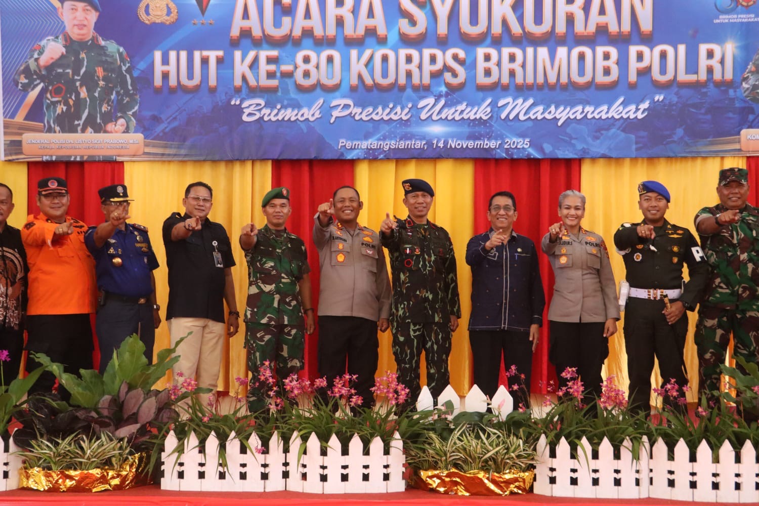 Kapolres Simalungun AKBP Marganda Aritonang, S.H., S.I.K., M.M., bersama jajaran Polres Simalungun menghadiri acara puncak peringatan dan syukuran Hari Ulang Tahun ke-80 Korps Brigade Mobil Kepolisian Negara Republik Indonesia (Brimob Polri) yang digelar di Aula Sugiono Kompi 2 Batalyon B Sat Brimob Polda Sumatera Utara, Jalan Medan, Kecamatan Siantar Timur, Kota Pematangsiantar, pada hari Jumat, 14 November 2025, mulai pukul 09.00 WIB hingga selesai.