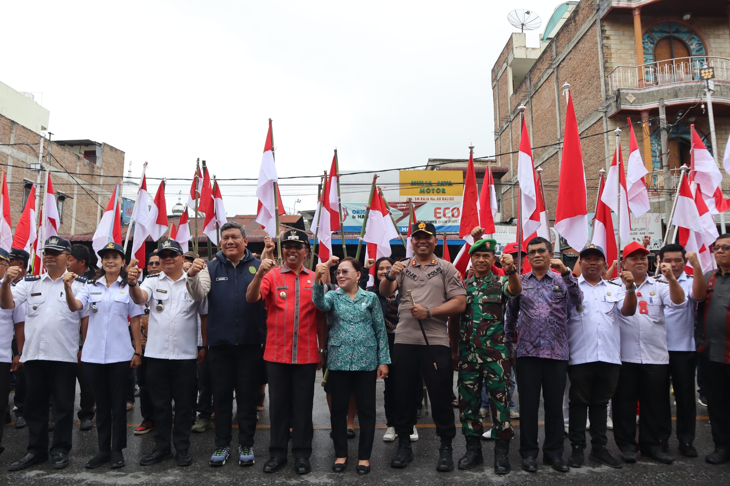 Kapolres bersama Forkopimda Kabuoaten Toba melaksanakan pembagian 10 Juta Bendera Merah Putih kepada masyarakat Kabupaten Toba di Balerong Balige. (EJP/Red)