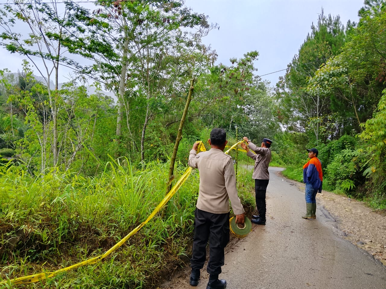 Kapolsek Silaen Beserta Anggota dan Warga Pantau Jalan Longsor dan Pasang Police Line Cegah Laka Lantas