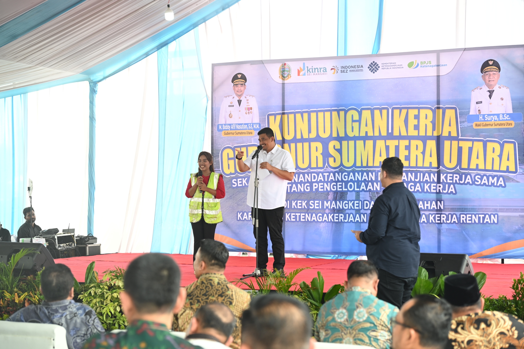 Hal tersebut disampaikan Bobby Nasution saat Kunjungan Kerja sekaligus Penandatanganan Perjanjian Kerja Sama Tentang Pengelolaan Tenaga Kerja di KEK Sei Mangkei, dan Penyerahan Kartu BPJS Ketenagakerjaan bagi Tenaga Kerja Rentan, di KEK Sei Mangkei, Kabupaten Simalungun, Kamis (9/10/2025).