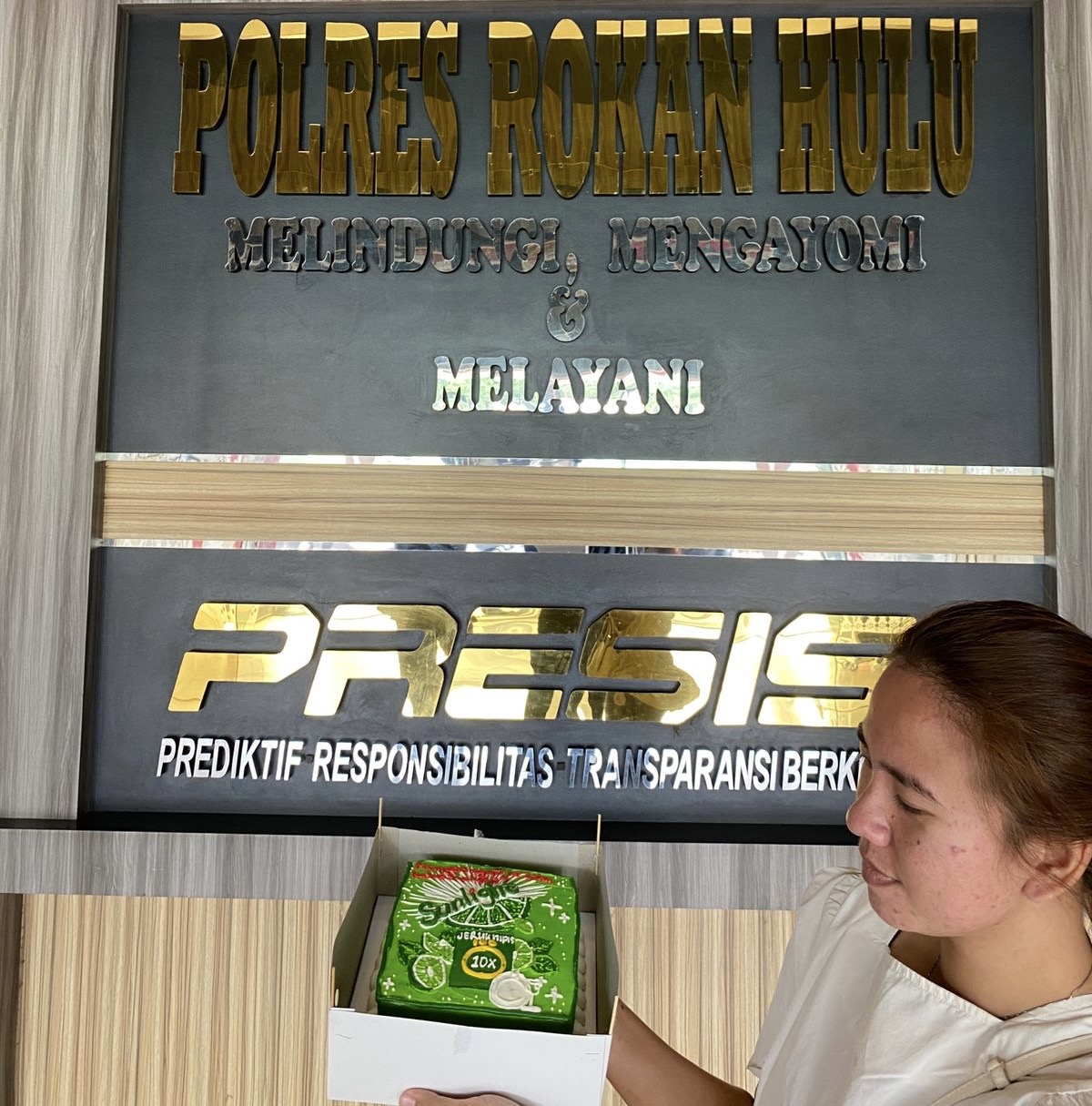 MIRANDA PURBA memberikan kue Memperingati 1 Tahun Kasus Sunlight Untuk Penyidik Polres Rokan Hulu dikarenakan merasa sangat kecewa sebagai seorang Ibu Kadung yang dilaporkan oleh Suaminya ke Polsek Ujung Batu dan dilimpahkan ke Polres Rokan Hulu terkait Kasus memberikan Cairan Pencuci Piring (Sunlight) kepada anak kandungnya yang saat ini sidangnya telah berlangsung.