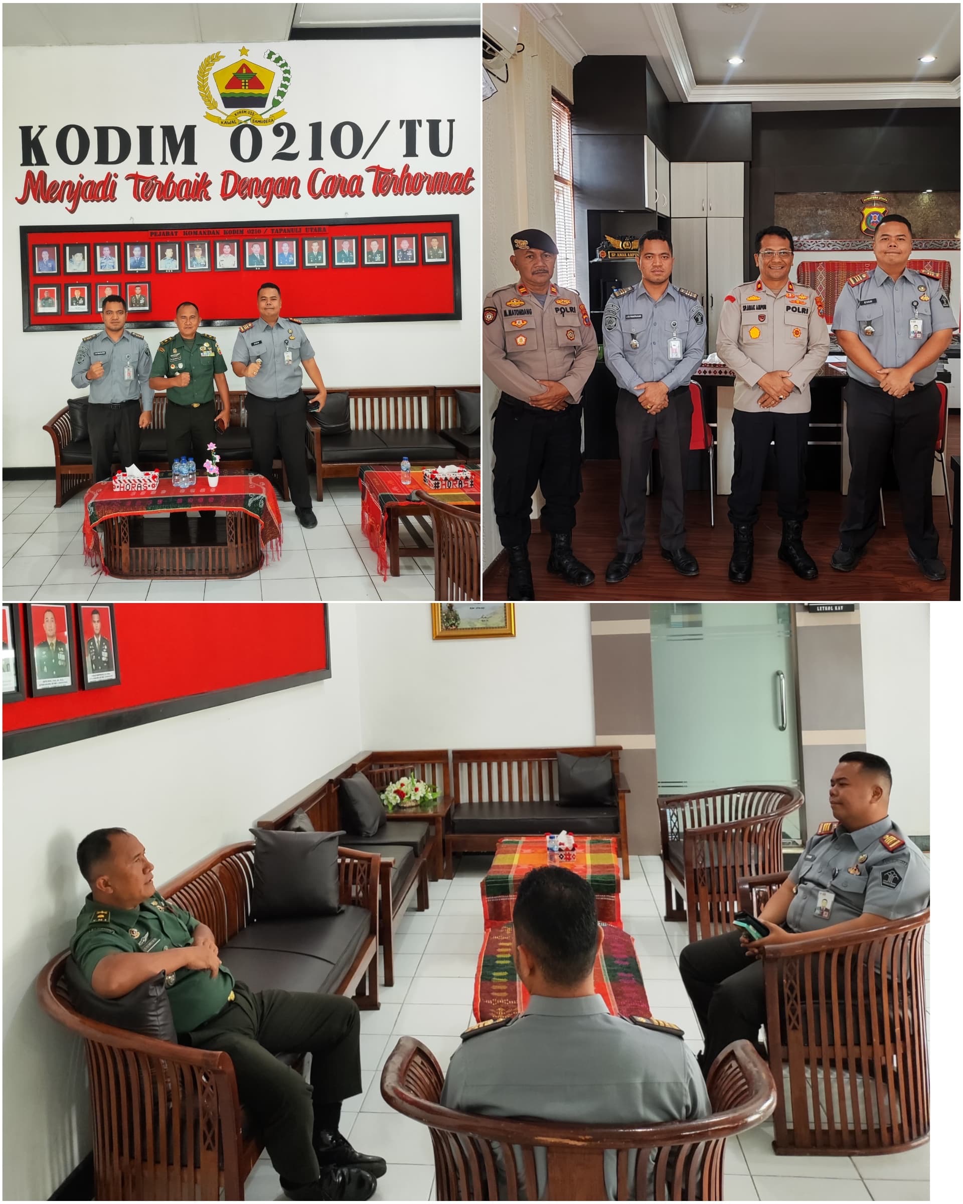 Kepala Rumah Tahanan Negara Kelas IIB Tarutung, Evan Yudha Putra Sembiring didampingi Kasubsi Pelayanan Tahanan, Jonias B. Pakpahan dan staf, Edward Sianturi kunjungi Kodim 0210/TU dan Polres Tapanuli Utara dalam rangka sinergi dalam peningkatan keamanan dan ketertiban di Rutan Tarutung, Selasa (17/6).