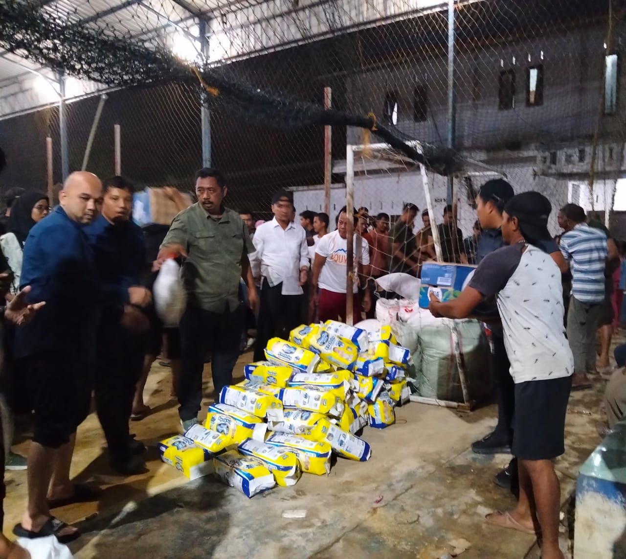 Dibantu personel TNI, bantuan tersebut diturunkan satu persatu dan disusun rapi di tempat penampungan sementara yang berupa Lapangan Futsal.