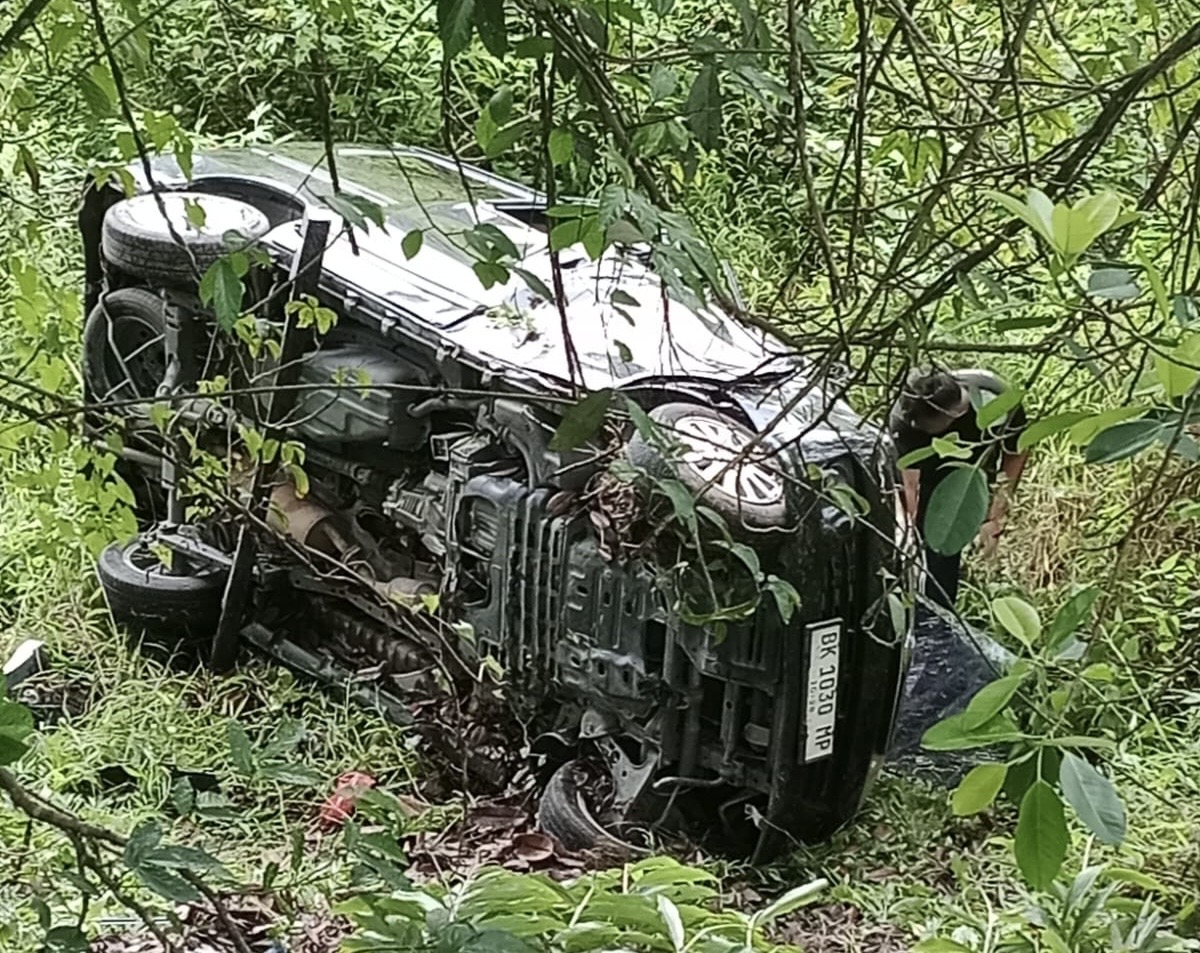 Sebuah Daihatsu Luxio No Pol BK 1030 MP tergelincir dan berjalan terlalu kekanan hingga masuk ke dalam jurang sedalam 10 meter.