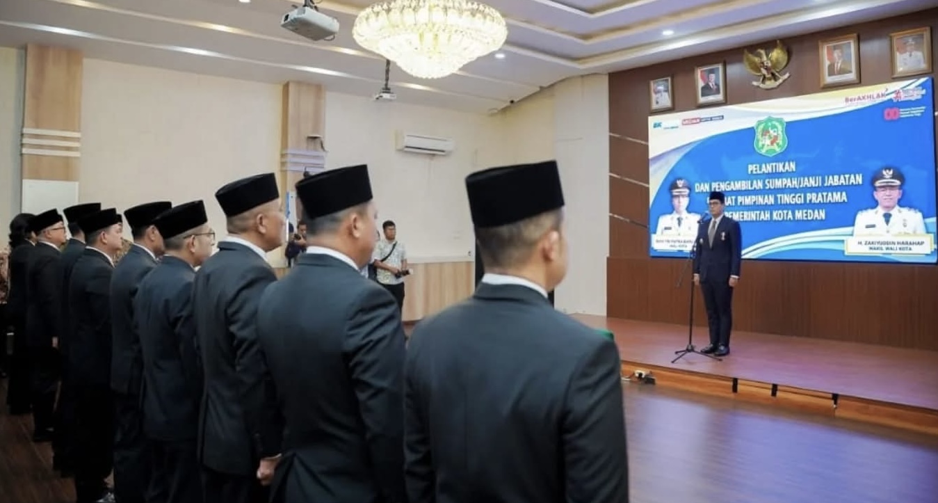 Wali Kota Medan Rico Tri Putra Bayu Waas melantik dan mengambil sumpah janji jabatan sebanyak 9 orang Pejabat Pimpinan Tinggi Pratama di lingkungan Pemko Medan, Kamis (21/8/2025). Dalam pelantikan yang dilaksanakan di Ruang Rapat III Balai Kota, orang nomor satu di Pemko Medan ini menegaskan, jabatan yang diamanahkan bukan sekadar kebahagiaan, tapi tentang tanggung jawab.