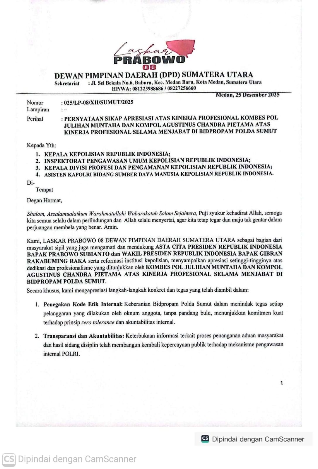 Pernyataan sikap apresiasi atas kinerja profesional Kombes Pol. Julihan Muntaha atas kinerja profesional selama menjabat di Bidpropam Polda Sumut juga kami sampaikan melalui surat nomor: 025/LP-08/XII/SUMUT/2025 yang ditujukan kepada Kapolri, Irwasum, Kadivpropam Polri, AS SDM Polri dengan tembusan kepada Presiden Prabowo, Wakil Presiden Gibran, Ketua Kompolnas, Hashim Djojohadikusumo selaku Ketua Dewan Pembina Laskar Prabowo 08, dan Devi Taurisa, SH., MH., C.L.D selaku Ketua Umum Laskar Prabowo 08, semoga surat pernyataan sikap apresiasi ini dapat menjadi refrensi Polri sebagai bentuk tingkat kepercayaan masyarakat, karena merupakan salah satu referensi utama bagi Polri dalam mengevaluasi dan meningkatkan kinerjanya secara berkelanjutan, tutup Paul. (Red)