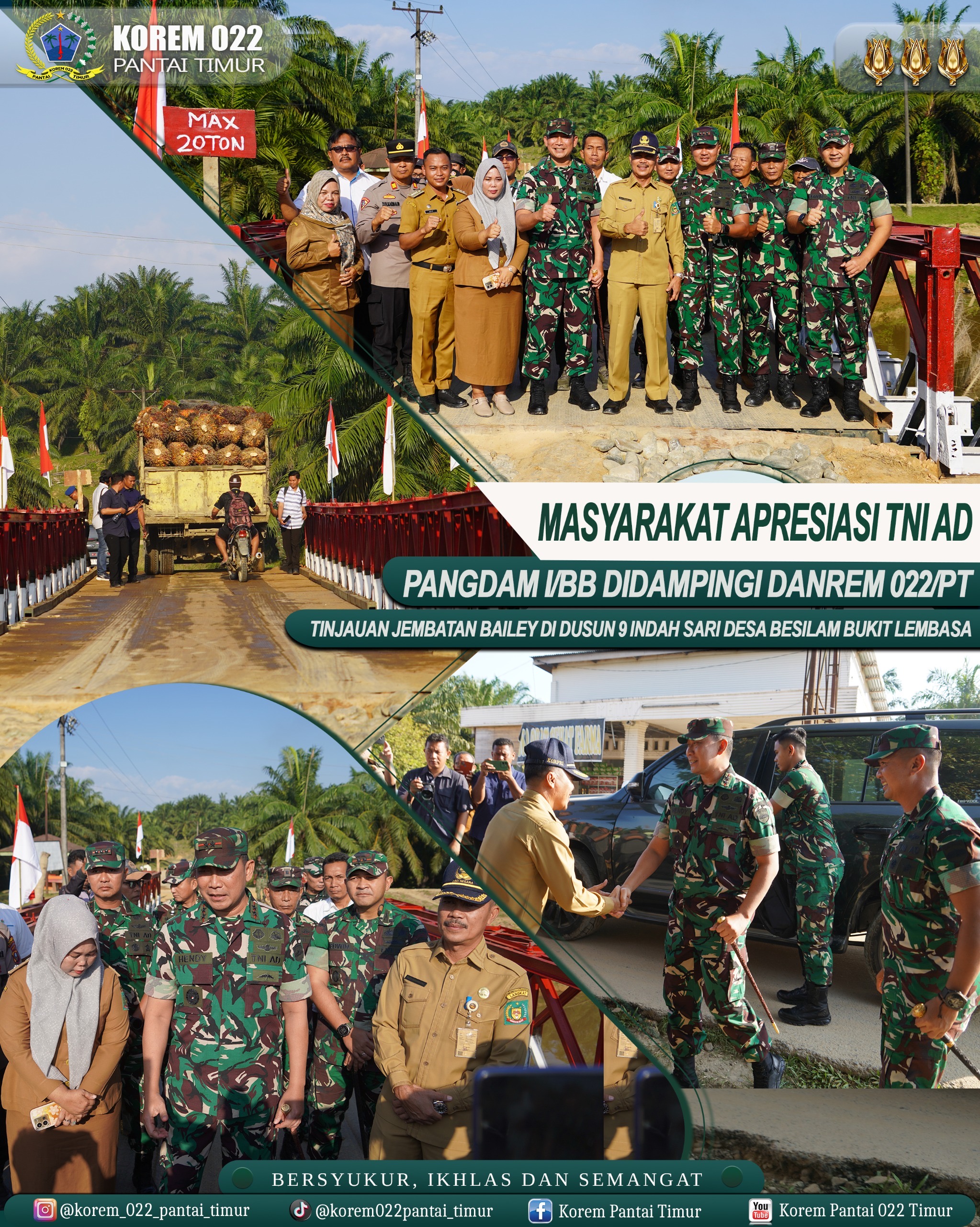 Peninjauan dilakukan untuk memastikan kondisi fisik jembatan Bailey sepanjang 30 meter dan lebar 3,65 meter tersebut, yang dibangun guna menghubungkan Desa Besilam Bukit Lembasa, Kecamatan Wampu, dengan Desa Banjaran Raya, Kecamatan Padang Tualang, Kabupaten Langkat. Selain itu, kegiatan ini juga menjadi ajang silaturahmi Pangdam I/BB bersama masyarakat serta unsur Forkopimda dan Forkopimca Kabupaten Langkat.