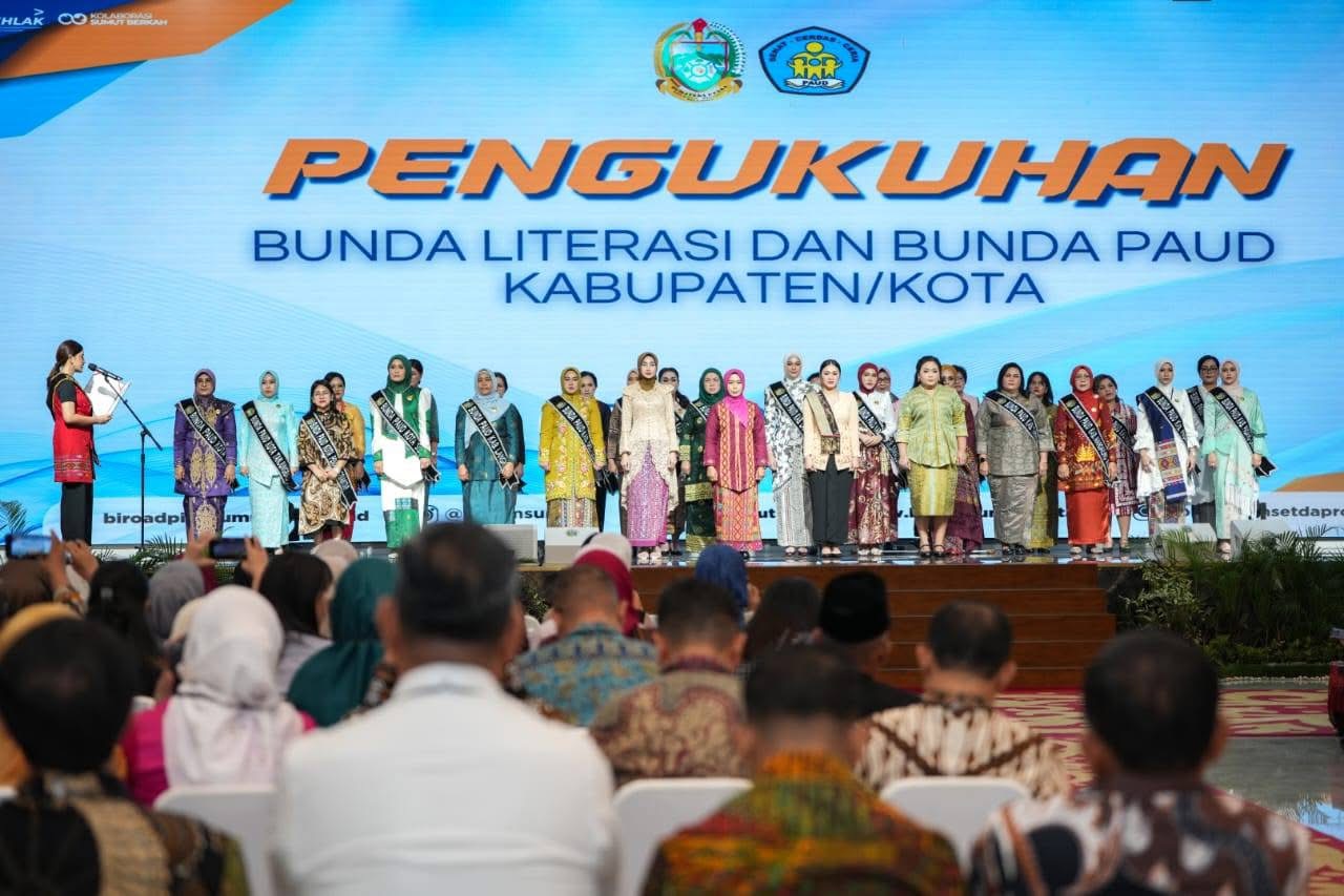 Pengukuhan diawali pembacaan Naskah Pengukuhan oleh Bunda PAUD dan Bunda Literasi Provinsi Sumut. Dilanjutkan pemasangan selempang kepada Bunda PAUD dan Bunda Literasi Kabupaten/Kota se-Provinsi Sumut.
