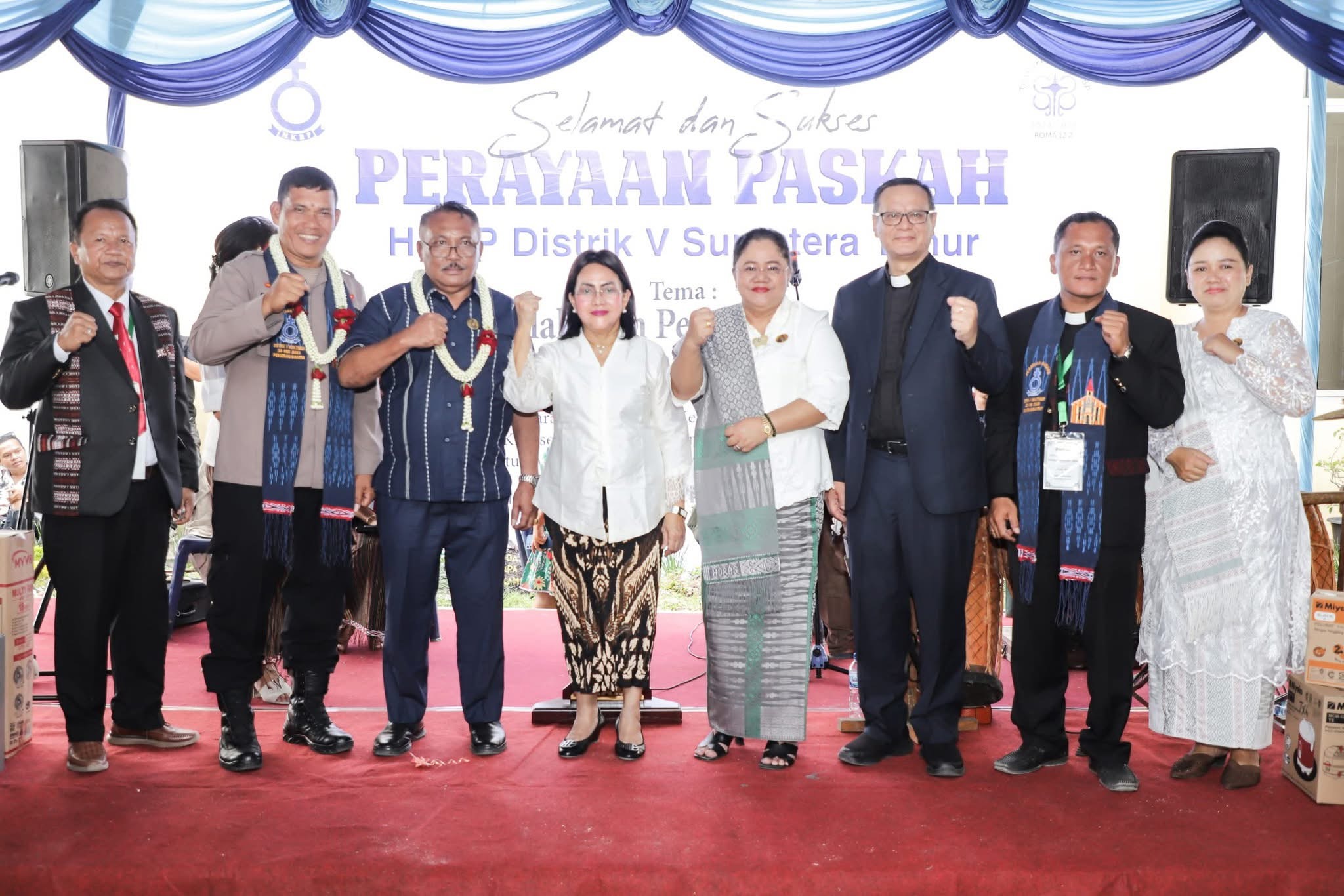 Ketua TP PKK Kota Pematangsiantar Ny Liswati Wesly Silalahi menghadiri Ibadah dan Perayaan Paskah HKBP Distrik V Sumatera Timur Tahun 2025. Ibadah dan Perayaan Paskah berlangsung di HKBP Tapian Nauli- Resort Tapian Nauli, Jalan Melanthon Siregar Kota Pematangsiantar, Minggu (18/05/2025).