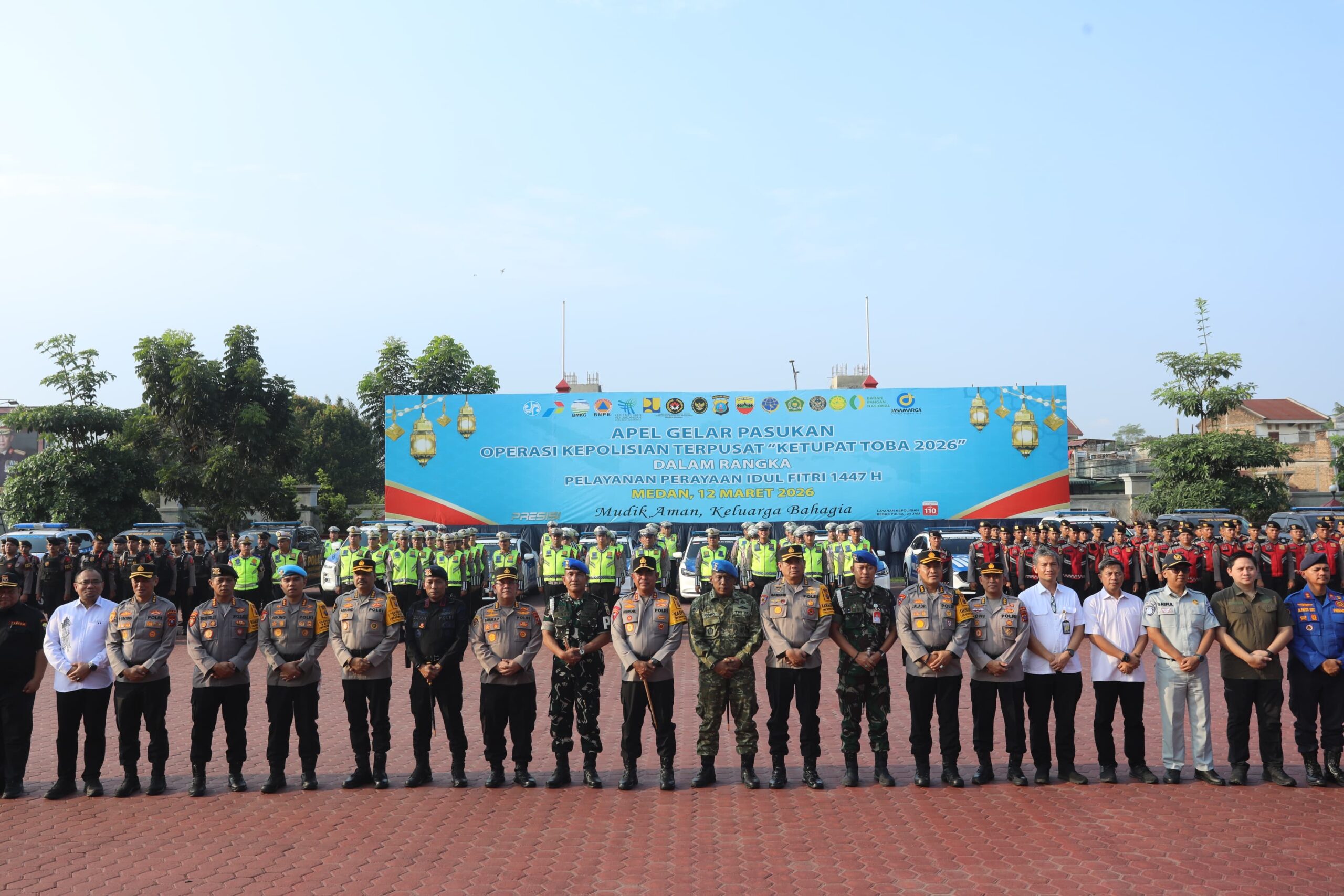 Kepolisian Daerah Sumatera Utara menggelar Apel Gelar Pasukan Operasi Ketupat Toba 2026 di Lapangan KS Tubun Mapolda Sumut, Kamis (12/3), sebagai bentuk kesiapan pengamanan arus mudik dan perayaan Hari Raya Idul Fitri 1447 Hijriah.