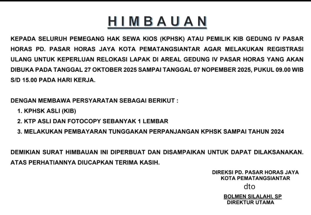 Manajemen Perusahaan Daerah Pasar Horas Jaya (PD PHJ) menghimbau kepada seluruh pemilik KPHSK (Kartu Pemilik Hak Sewa Kios) Gedung IV Pasar Horas, agar melakukan registrasi untuk keperluan relokasi atau menempati lapak ke area bekas gedung 4.