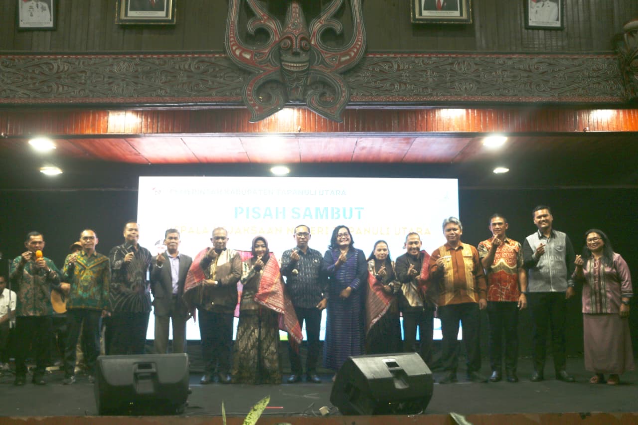 Bupati Tapanuli Utara Dr. Jonius Taripar Parsaoran, S.Si., M.Si dan Ketua TP PKK Ny. Neny Angelina JTP Hutabarat didampingi Wakil Bupati Dr. Deni Parlindungan Lumbantoruan, ST, M.Eng bersama unsur Forum Koordinasi Pimpinan Daerah (Forkopimda) serta tokoh masyarakat menghadiri Acara Pisah Sambut Kepala Kejaksaan Negeri (Kajari) Tapanuli Utara dari Donny K. Ritonga, S.H., M.H. kepada Dedy Frits Rajagukguk, S.H., M.H., yang dilaksanakan di Gedung Sopo Partungkoan Tarutung, Kamis (6/11/2025).