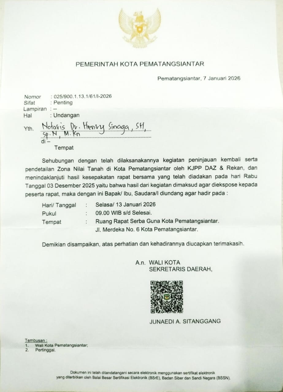 Pemerintah Kota (Pemko) Pematangsiantar, mengundang Notaris Dr Henry Sinaga guna membahas hasil pelaksanaan peninjauan kembali serta pendetailan Zona Nilai Tanah (ZNT) di Kota Pematangsiantar yang dilakukan oleh Kantor Jasa Penilai Publik (KJPP) DAZ dan Rekan.