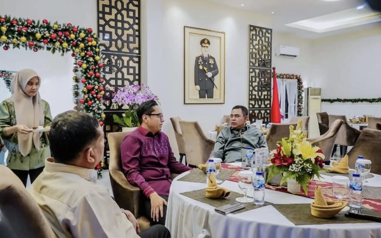 Wali Kota Medan Rico Tri Putra Bayu Waas menghadiri open house Natal 2025 yang digelar Kapolda Sumatera Utara Irjen Pol Whisnu Hermawan Februanto di rumah dinas Kapolda Sumut, Kamis (25/12/2025) siang.