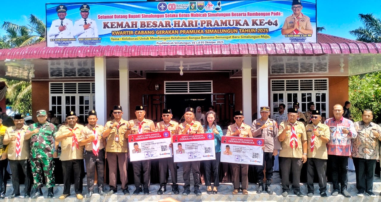 Kwartir Cabang (Kwarcab) Gerakan Pramuka Kabupaten Simalungun menggelar upacara Peringatan Hari Pramuka Ke-64 Tahun 2025 di lapangan Kwarcab Simalungun (CADIKA), Jln Asahan Km. 6,5 Kecamatan Siantar, Kabupaten Simalungun, Sumatera Utara, Kamis (2/10/2025. Acara ini menjadi momentum penting untuk memperkuat semangat kolaborasi dalam membangun ketahanan bangsa.