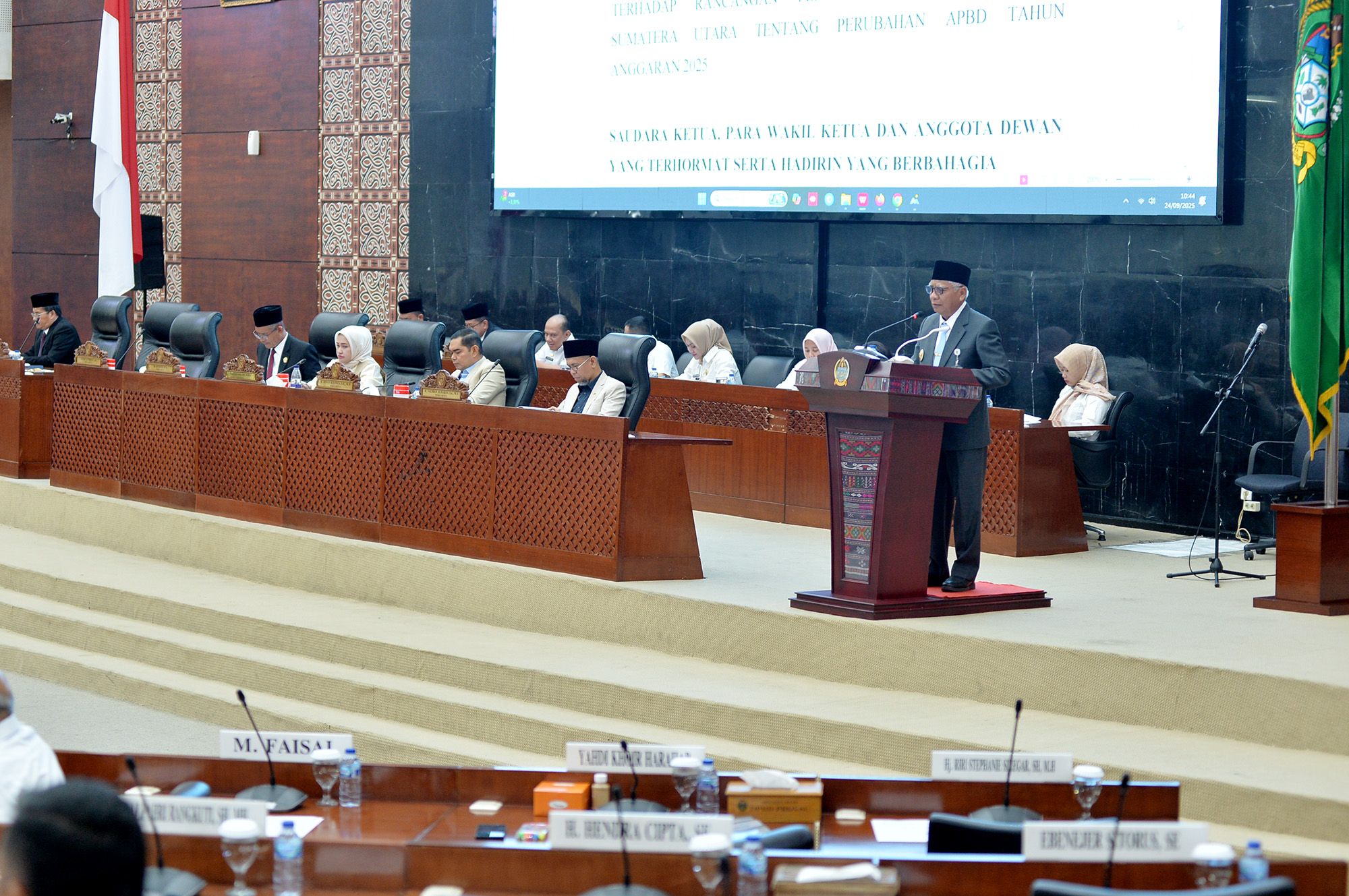 Hal tersebut disampaikan Wakil Gubernur (Wagub) Sumut Surya saat membacakan Nota Jawaban Gubernur Sumut atas Pandangan Umum Fraksi-Fraksi Dewan Perwakilan Daerah (DPRD) Sumut terhadap Ranperda Perubahan APBD Tahun Anggaran 2025, dalam Rapat Paripurna di Gedung Dewan, Rabu (24/9/2025).