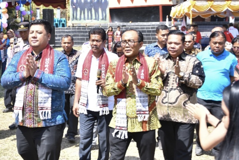 Bupati Samosir Vandiko T. Gultom bersama Wabup Ariston Tua Sidauruk hadir dalam Hari Ulang Tahun Ke-12 Tugu Raja Simanihuruk yang digelar di Komplek Tugu Raja Simanihuruk-Harapohan Kecamatan Pangururan, Kamis (26/06/2025).