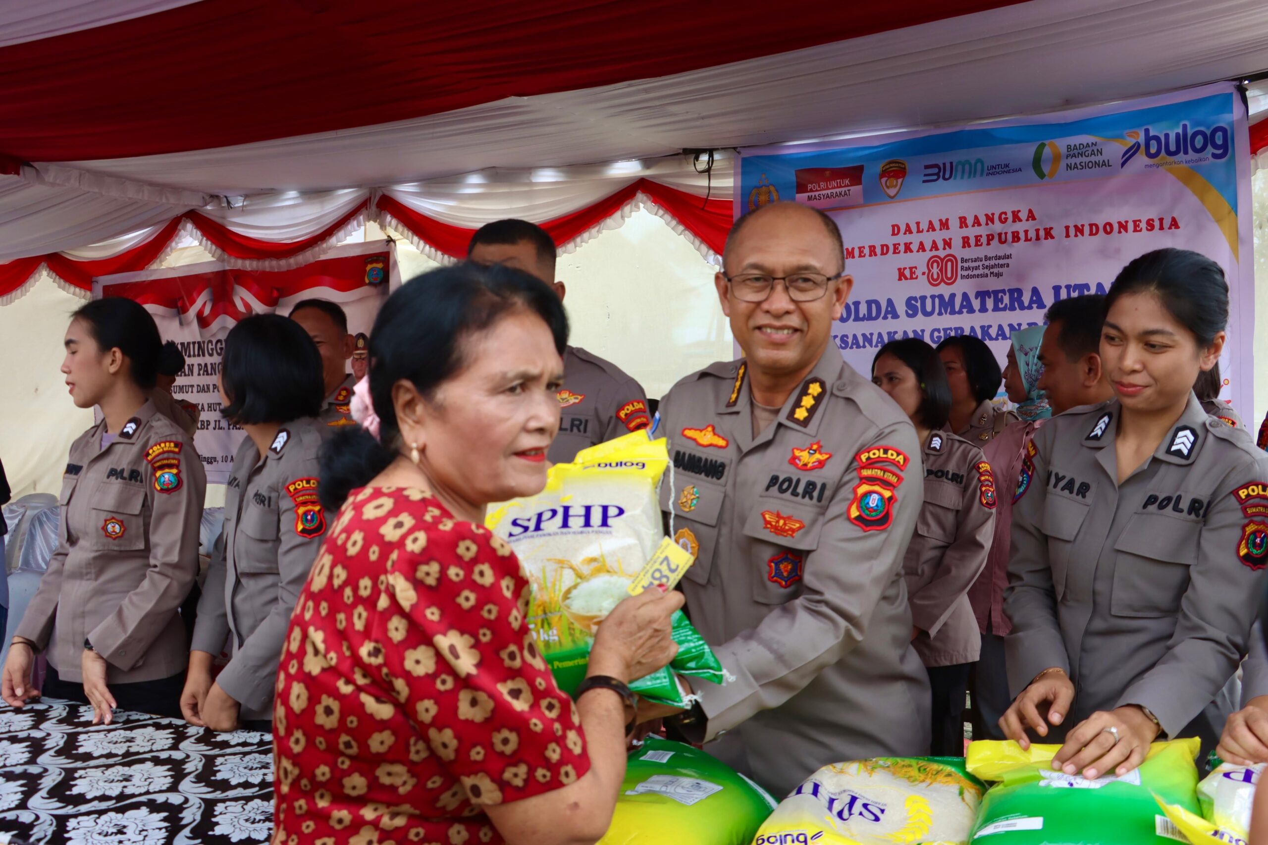 Polda Sumut bersama Polres Pelabuhan Belawan melaksanakan kegiatan Minggu Kasih dan Gerakan Pangan Murah (GPM) di Gereja HKBP Pajak Baru Belawan pada Minggu (10/8).