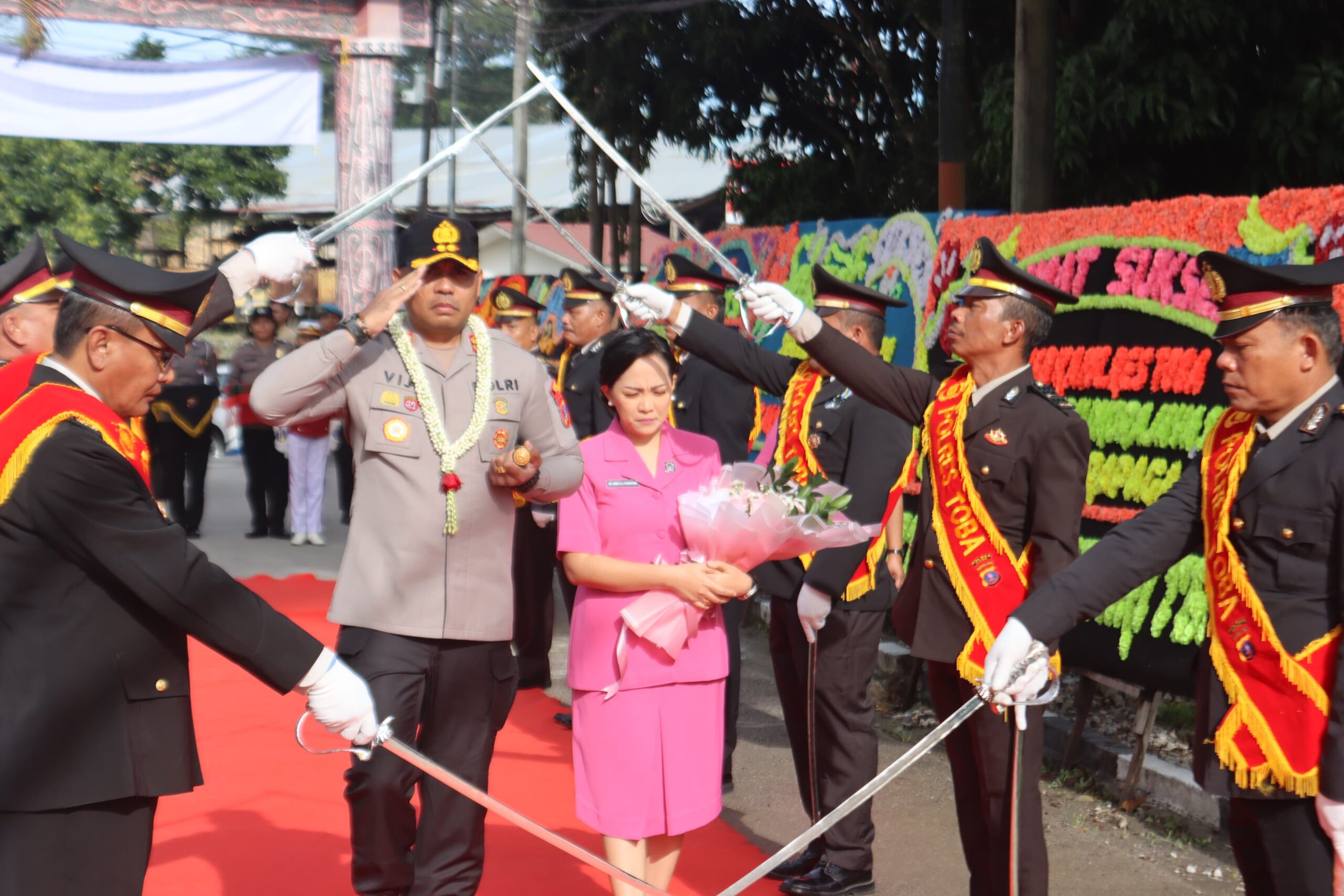 Suasana penuh kehangatan dan kearifan lokal mewarnai penyambutan Kapolres Toba yang baru, AKBP V. J. Parapaga, S.I.K. dan Ibu Ketua Bhayangkari Cabang Toba Ny. Theresia Mira V. J. Parapaga di Mapolres Toba, Sabtu (26/4/2025)