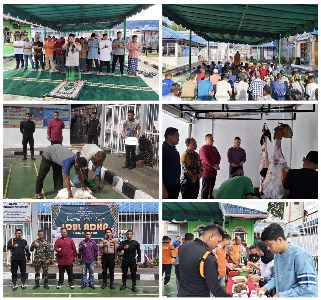 Suasana pagi penuh khidmat dan kebersamaan menyelimuti Rumah Tahanan Negara Kelas IIB Tarutung dalam perayaan Idul Adha 1446 H yang berlangsung di lapangan serba guna Rutan. Kegiatan diawali dengan pelaksanaan Shalat Idul Adha yang diikuti oleh seluruh pegawai dan warga binaan yang beragama Islam, Jumat (6/6/2025).