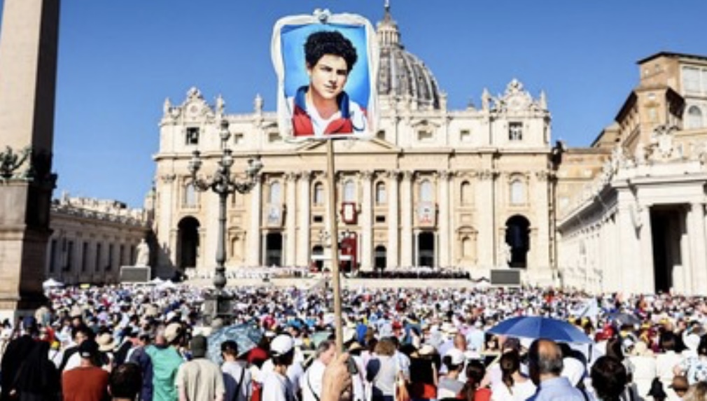 Di lapangan Santo Petrus, Vatikan, kerumunan besar berkumpul, melambaikan plakat dan bendera bergambar Acutis. Pemuda berusia 15 tahun yang meninggal akibat leukimia pada 2006 ini kini sah menjadi santo.